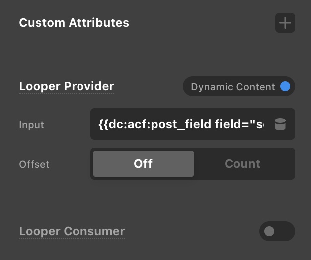 4.) The Looper provider will be set to “Dynamic Content” and use “{{dc:acf:post_field field="secondary_images"}}” as the dynamic content code.