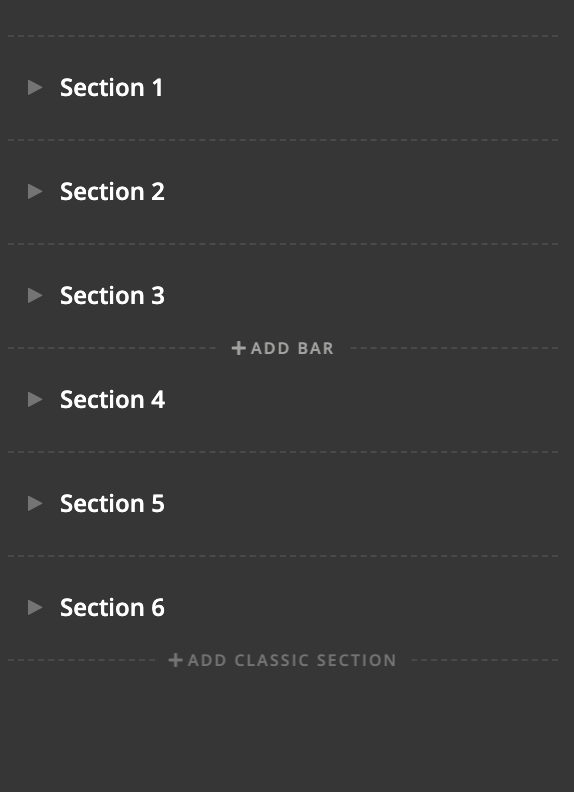 After importing a whole page template, I discovered that instead of “add section” it says “add bar” between all sections. And at the bottom it says “add classic section”