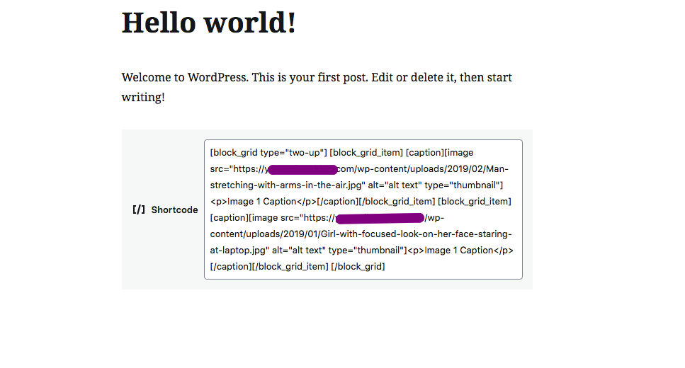 [block_grid type="two-up"] [block_grid_item] [image src="https://yourwebsite.com" alt="alt text" type="thumbnail"]<p>Image 1 Caption</p>[/block_grid_item] [block_grid_item] [image src="https://yourwebsite.com" alt="alt text" type="thumbnail"]<p>Image 1 Caption</p>[/block_grid_item] [/block_grid]