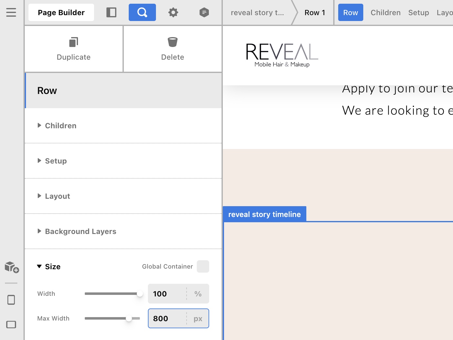 Thanks for writing in! In your Row element settings, find the Size option and disable the “Global Container”. You need to insert 100% Width and then set a Maximum Width in a fixed pixel value.
