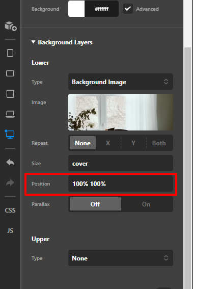 Also, the background photo in the header is zoomed in too much. How can we zoom it out as much as possible so we see more of her dress and shoulders? I erased “center” from position because it was cutting off her head.