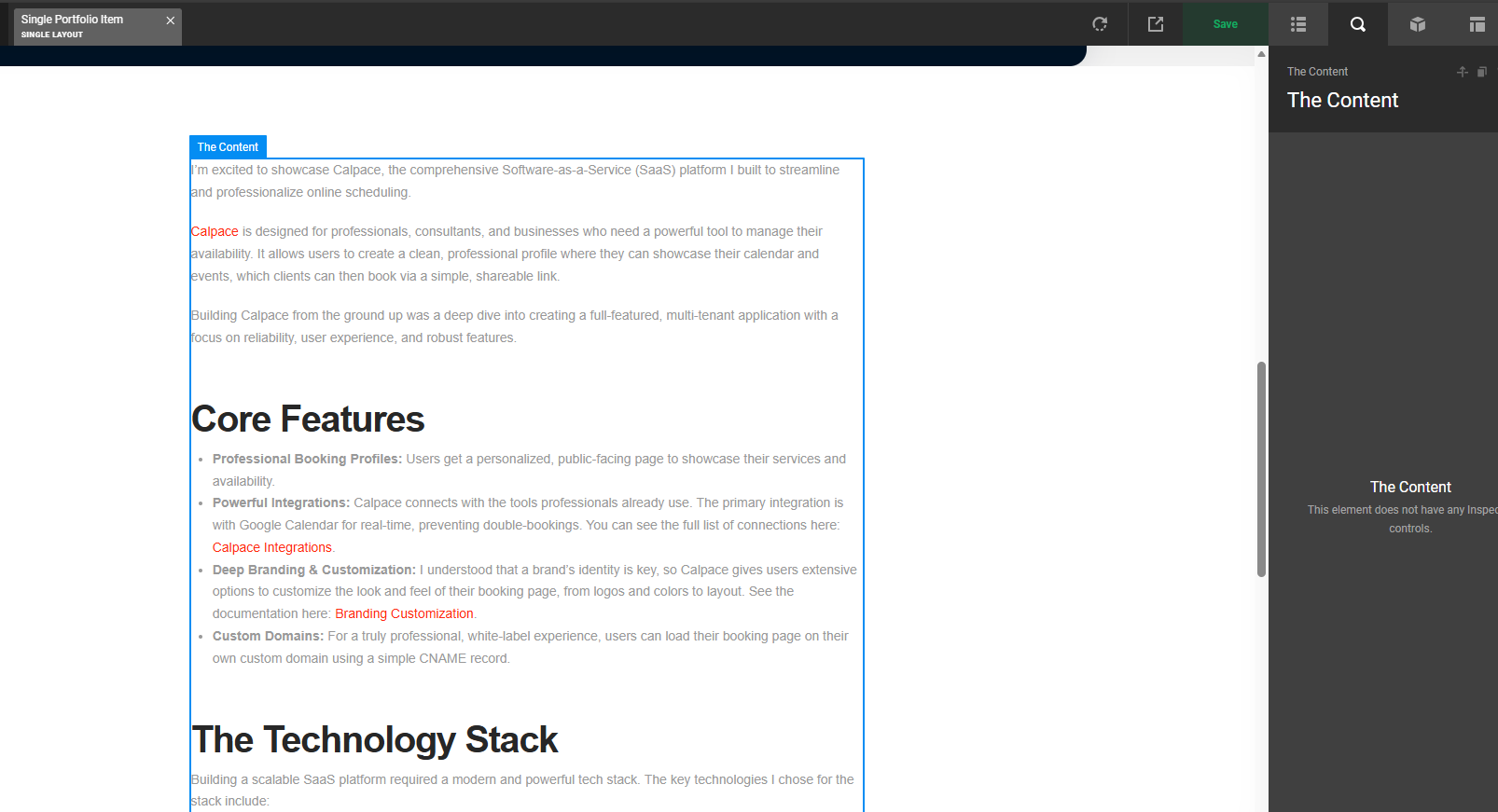 Your Single Portfolio Item is a custom single layout to display each of your portfolio items. This is the overall layout of your portfolio item pages. On this layout, you have the “The Content” element, which is the placeholder of the portfolio item content: