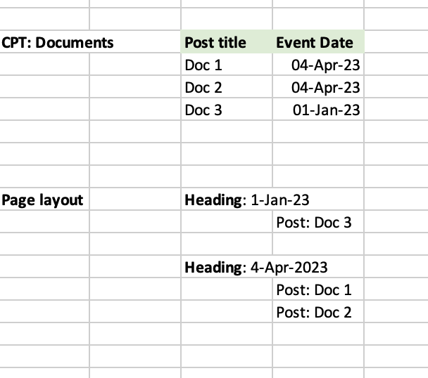 I have a CPT with documents. Each document has a date. I want to output a page showing the documents grouped by the date, most recent first. I can write a looper to retrieve the documents and their dates, but I’m stuck on the grouping approach. I tried a nested looper, but that gets run for each of the outer loop items, rather than once per date.