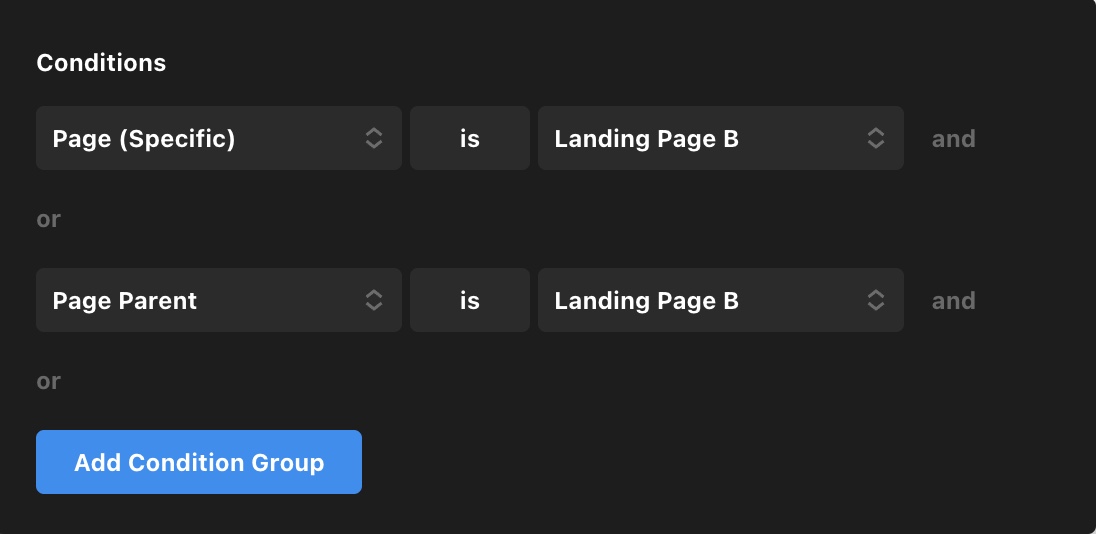 I’m creating dozens maybe a hundred landing pages. I want to use least 2 or 3 different custom headers for these pages. If I create a landing page template for say Group 1 that consists of 50 pages, how can I use a custom header with these pages without adding conditions using Page (Specific) for each page? I don’t want to have 50 lines of conditions in there.