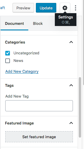 In the meantime, if you’re using the latest version of WordPress for some sites, you may see a difference as well for the post settings. For newer versions of WordPress with Gutenberg editor, post settings can be accessible through the settings cogwheel on top right hand corner.