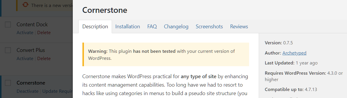 Thank you for sharing. That is weird. I’ve tested the plugin by Archetyped which is in conflict with our Cornerstone plugin for a very long time. I clicked View Details and I didn’t get the info like in your screenshot so this looks like our Cornerstone plugin somehow got mixed up with the other plugin only in your site.