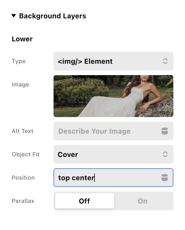 And then for your Background image, set it to Cover and position it to Top Center so that the head of the lady will not be cut off.