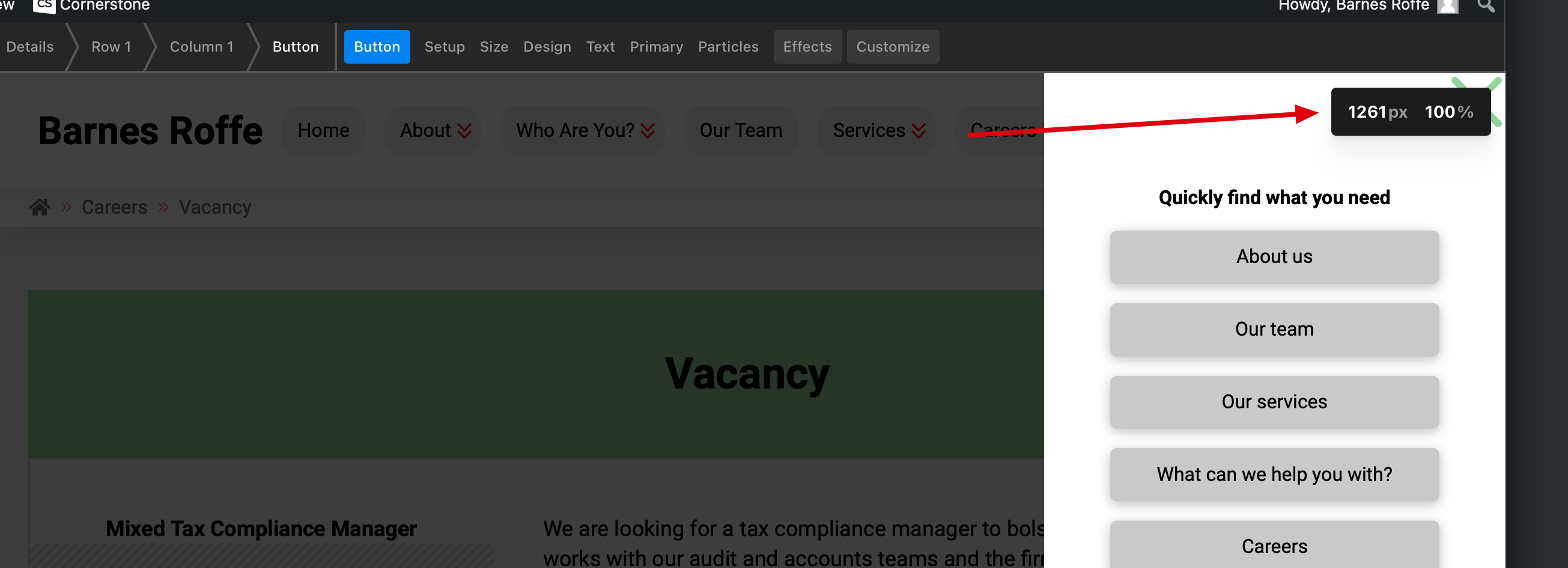 I’ve clicked to open a modal side panel, the black panel with the pixel dimensions obscures the Close X in the top right and whilst editing a page I can’t close the modal.