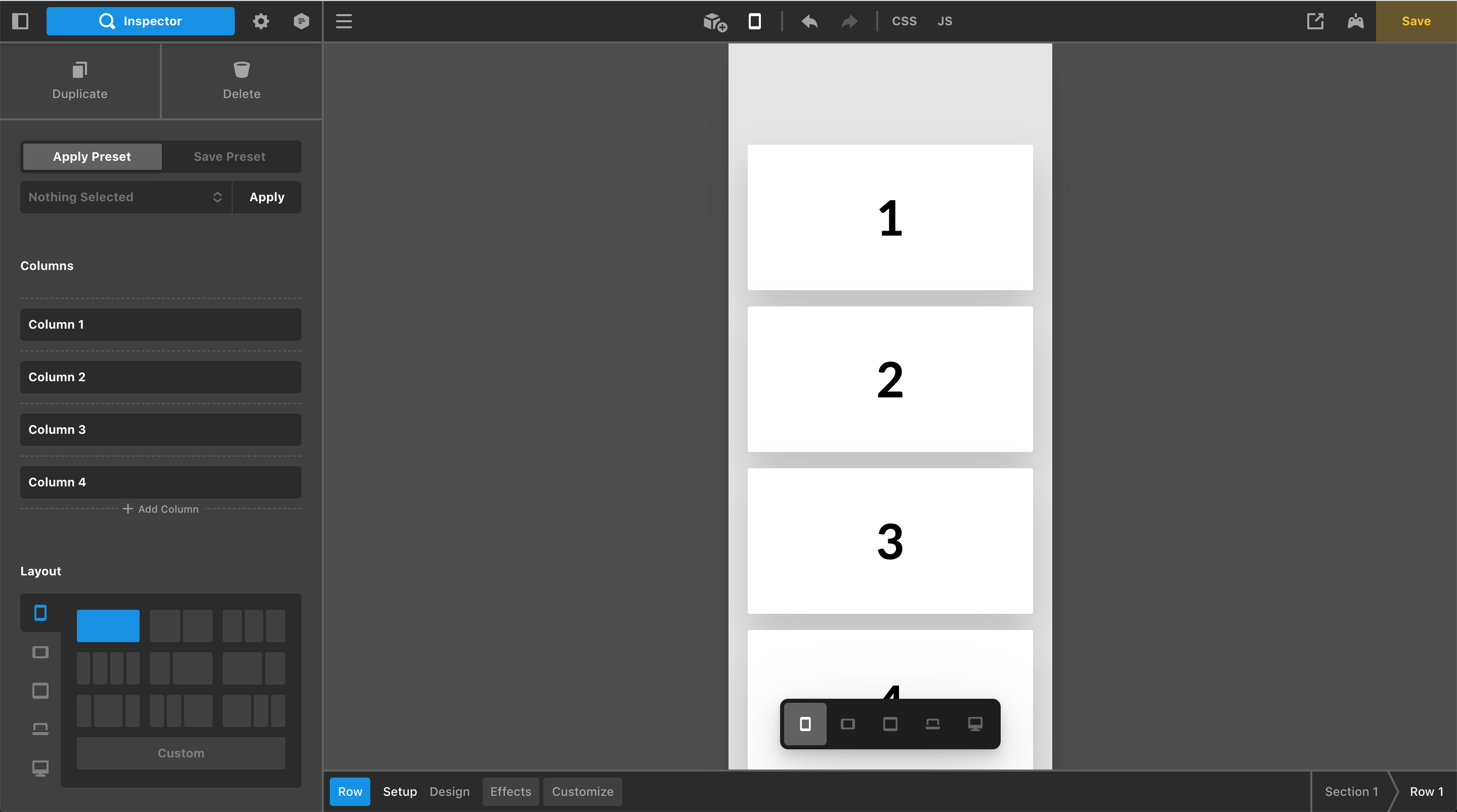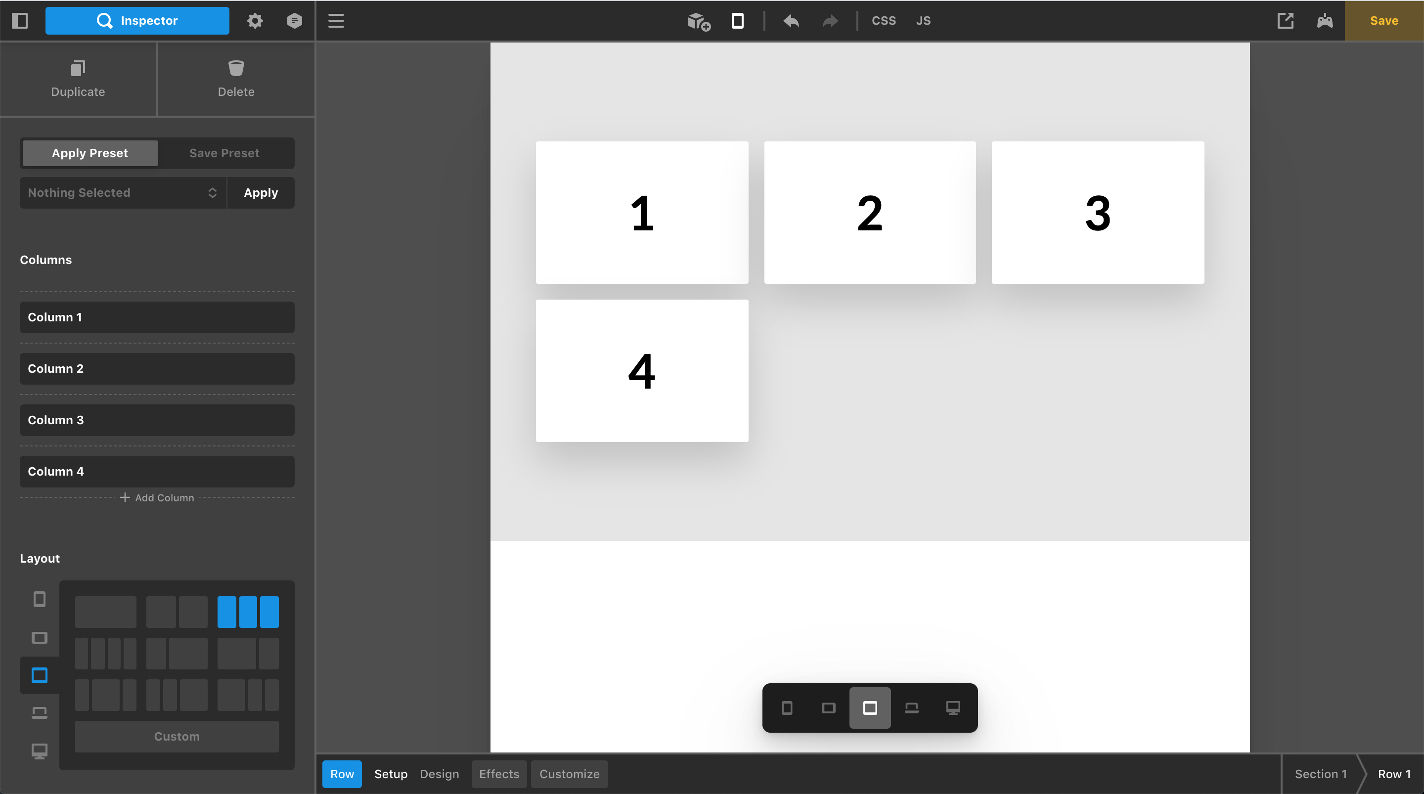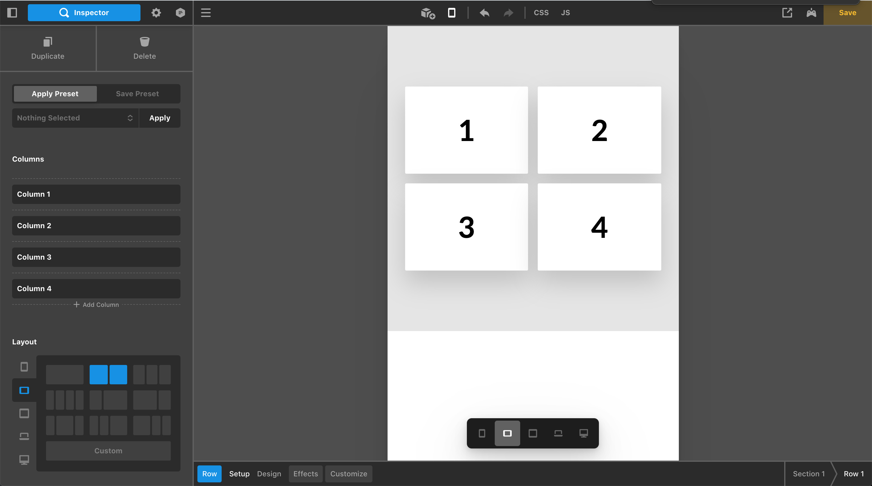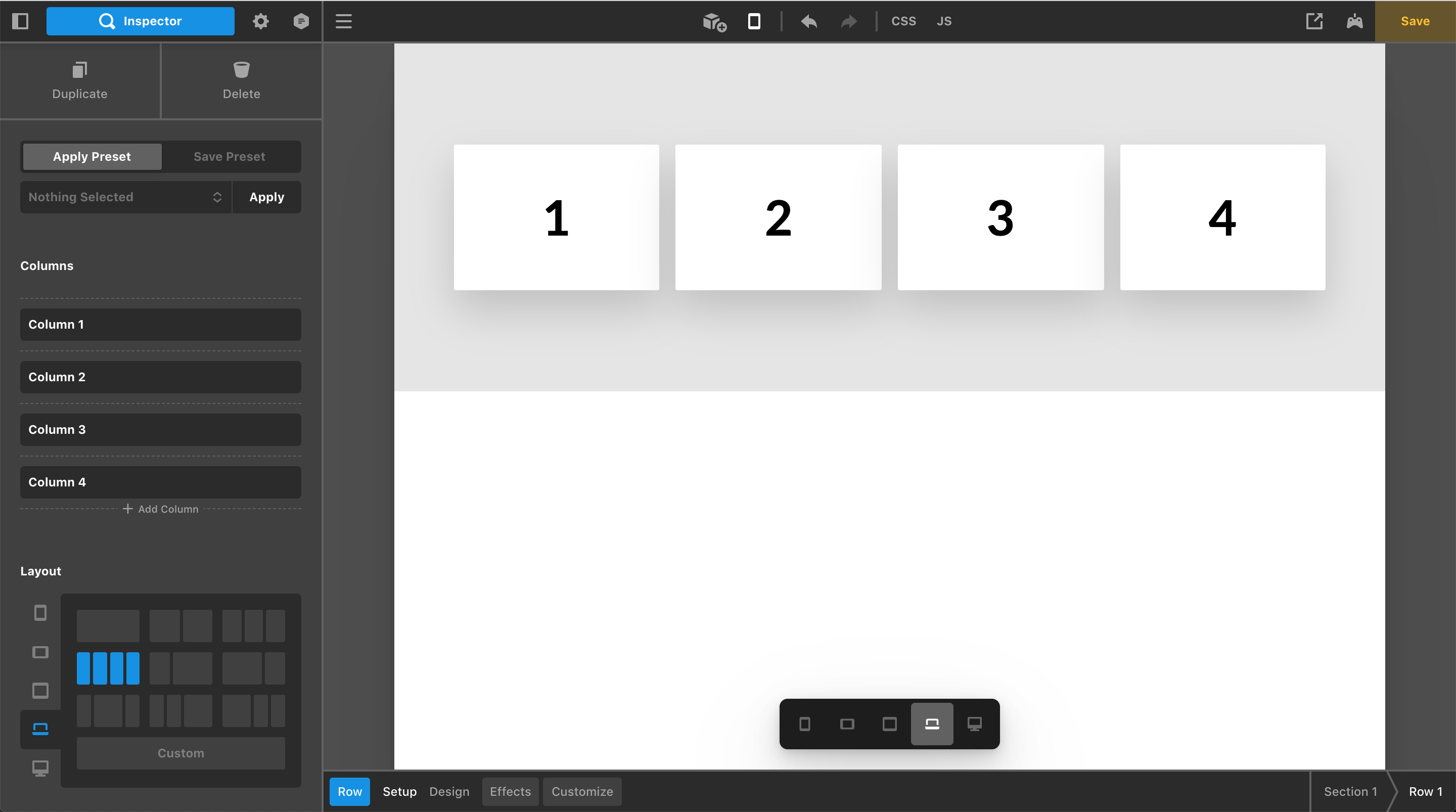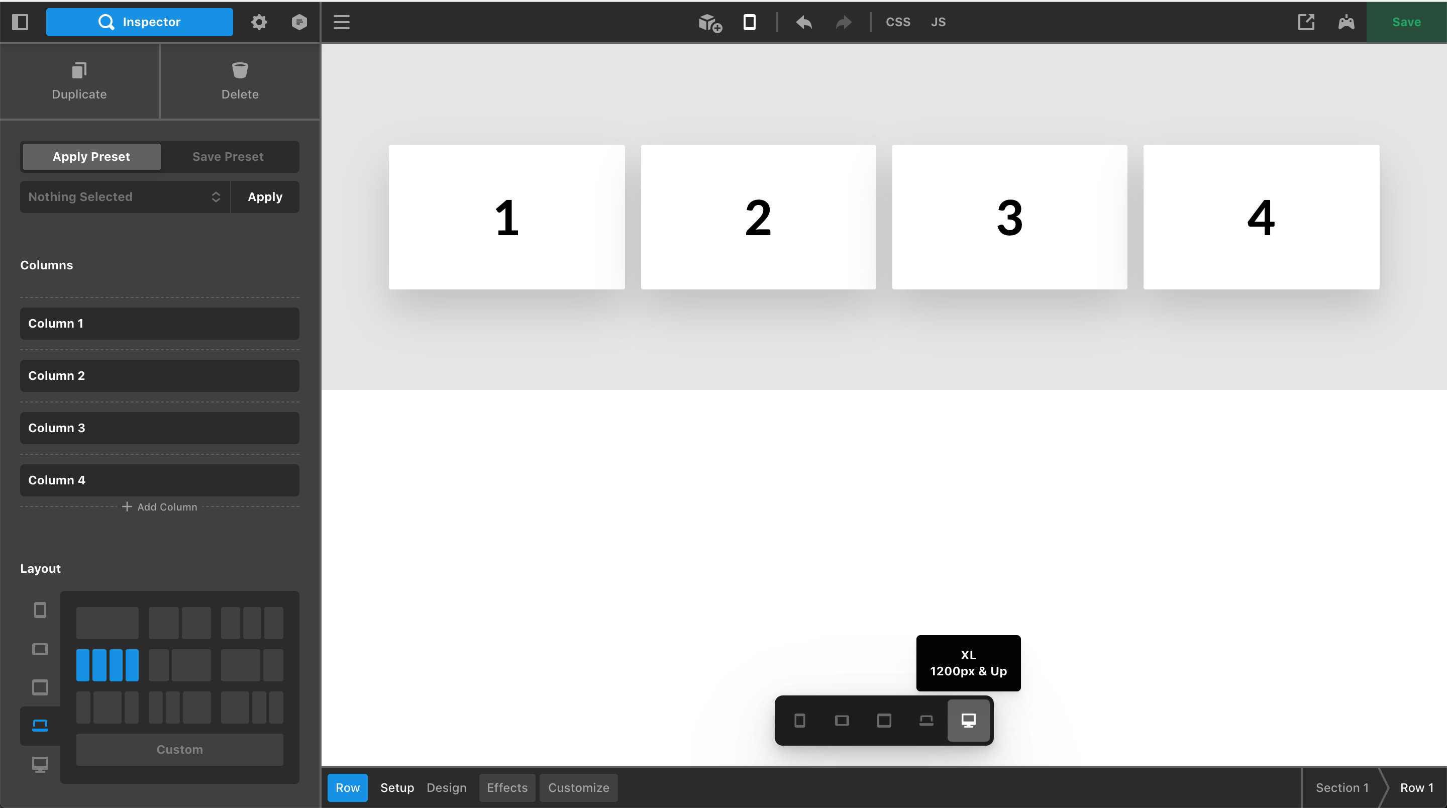 Notice that on this screenshot from my computer the XL breakpoint is selected in the responsive picker (which is 1200px and up), but over in the workspace it shows the currently active breakpoint (denoted by the blue icon) as LG. This is because with the workspace present, it cuts into my screen real estate a bit and LG is technically the “largest” breakpoint I can see in the builder, while on the frontend I can actually see XL. All this to say, it’s just important to ensure that you’re actually editing the proper breakpoint by selecting the appropriate breakpoint tab in the workspace when working on layouts. I’ve created the following selections as well in the builder, which all appear to be working: