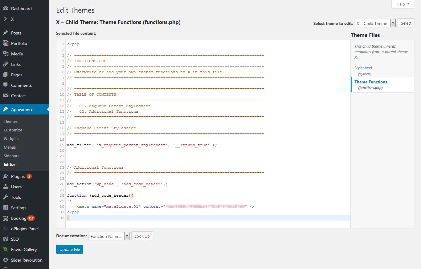 Ended up adding the code via FTP. I didn’t do it so can’t say what code was used. This was a Bing Microsoft identification code, a little different than usual Google analytic and such.