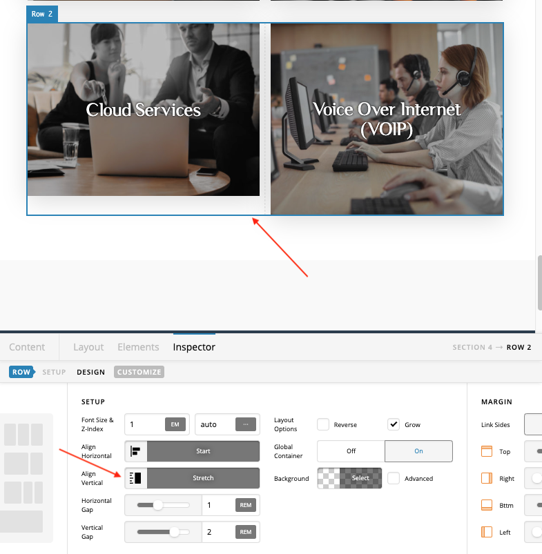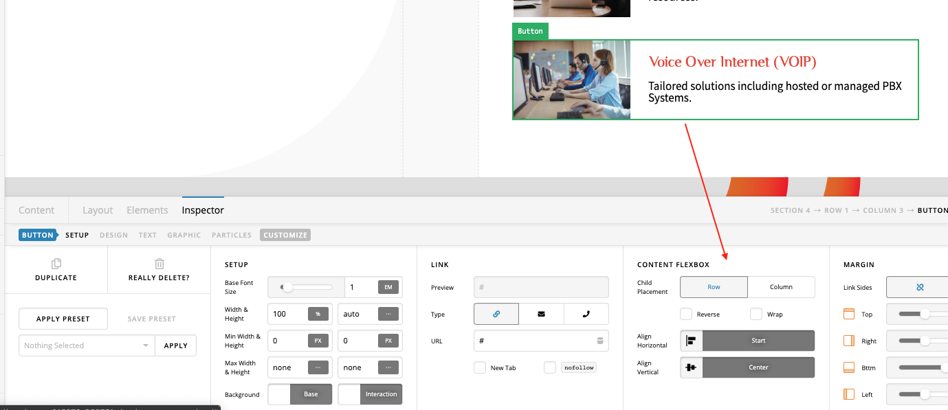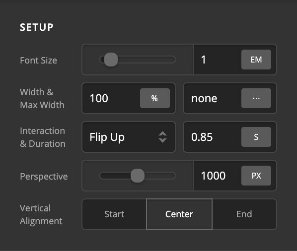 That “Vertical Alignment” control at the bottom of the Setup control group for the card allows you to vertically place the text and text/button content for the front/back of the Card respectively. Horizontal layouts of the text/button on the back face of the Card could present responsive issues very quickly, so we opted to make the main content only have an option to align it vertically.