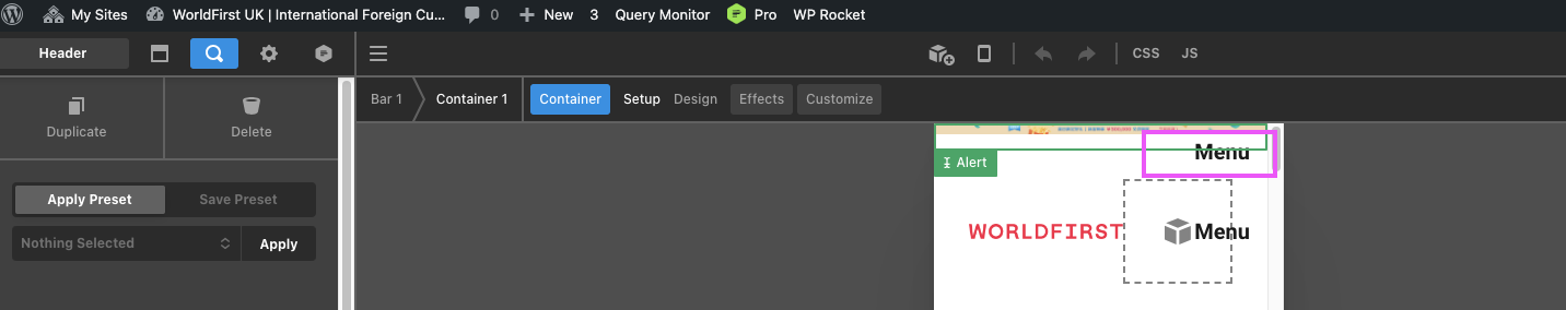 Am trying to use the alert block and have added this in the bar > container but then on mobile it is showing the burger menu again.