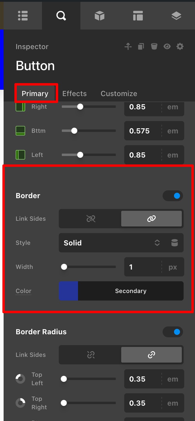 However, if you add a new button element and turn on the border property and instantly unlink the sides, you will not be able to set the interaction state within the color selector but would have to use css.