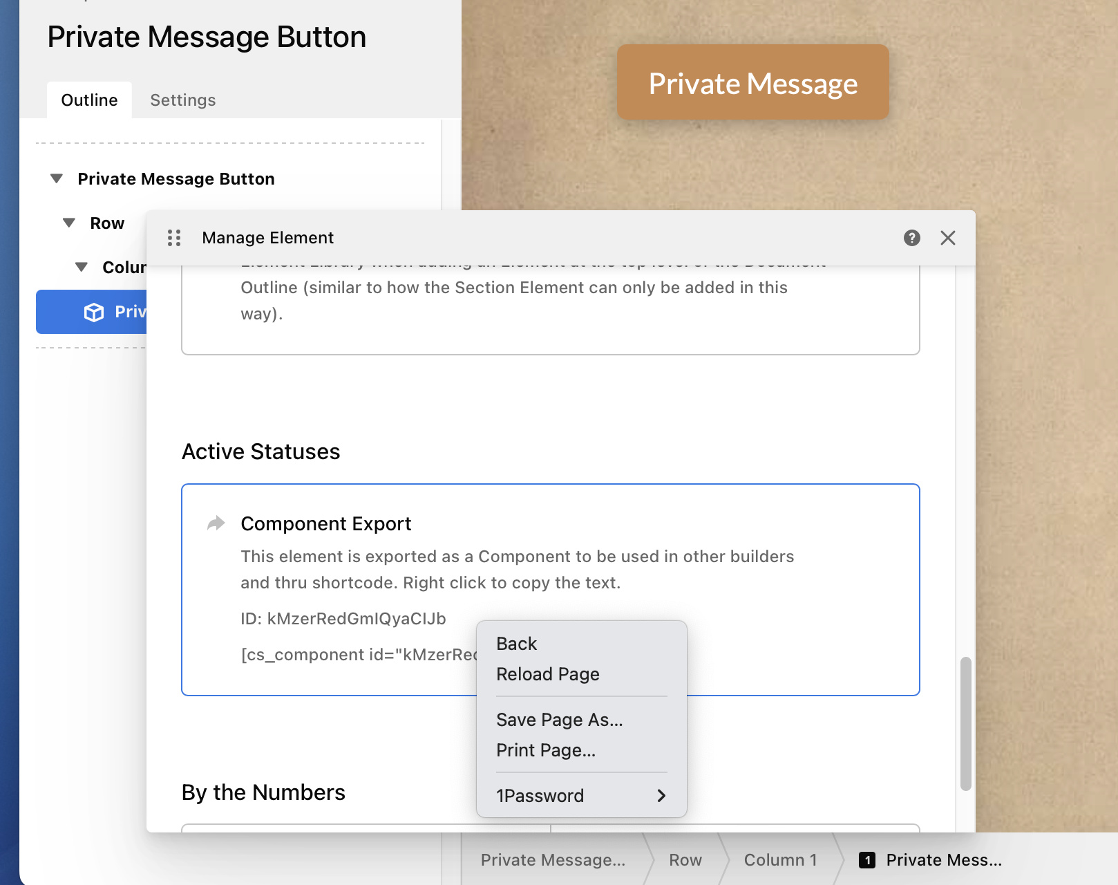 I have created a button component. I have selected the Top level (section of the button, right-clicked and selected Manage Element. I clicked Export Component, scrolled down to Component Export (I can see the shortcode). But right clicking does not give me the option to copy the shortcode. I have read the documentation, reviewed the forum but I cannot figure out how to select the shortcode. What am I doing wrong? Jim