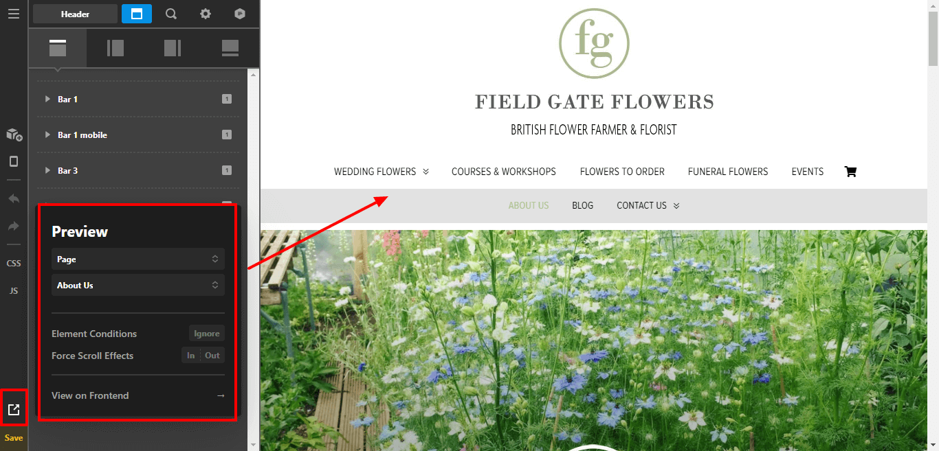 I have a no header/no footer/no container page as the homepage for https://fieldgateflowers.co.uk. However, I cannot view the headers to edit.