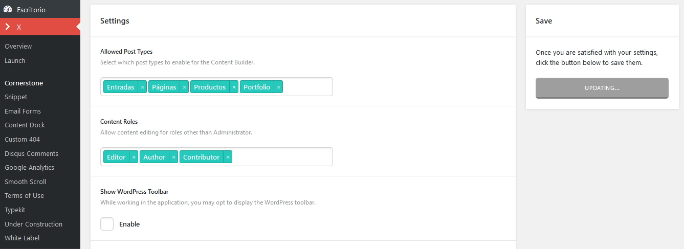Hi @nico, thanks for answering. I hit the button UPDATE and nothing happens, It do not update, it keeps updating for hours and never applies the settings. I´d like to set up like it is in the image, but I can not. Don´t know why. I already have the update versions of everything (cornerstone, xtheme, etc) and I already write down my admin credentials. Please help me!