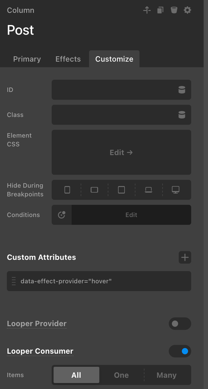 I added my own custom attribute data-effect-provider="hover" to the Post column.