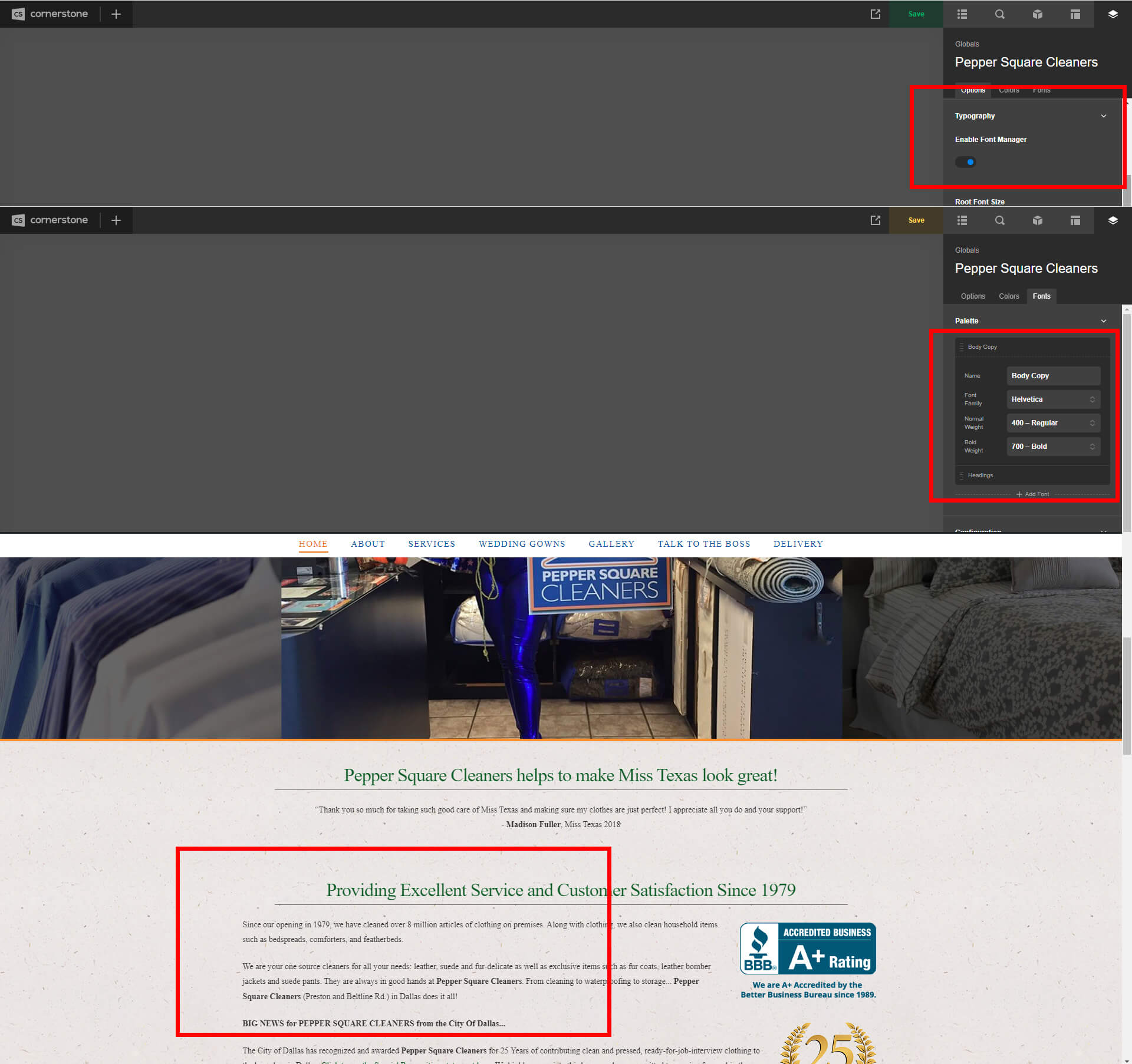 I’ve logged in and updated X and Cornerstone on this site (https://peppersquarecleaners.com) and tried to apply new business hours to the pages and page top. (New hours: mon to fri 7am to 6pm, saturdays 7:30am to 5:00pm.) They appear in the work environment when I’m logged in, but they don’t show as corrected when I view the site in another browser (like Firefox). Also the font appears to different in the work environment (it shows a serif font), it should be a non-serif font. Can you tell me what you find out? More info to come…