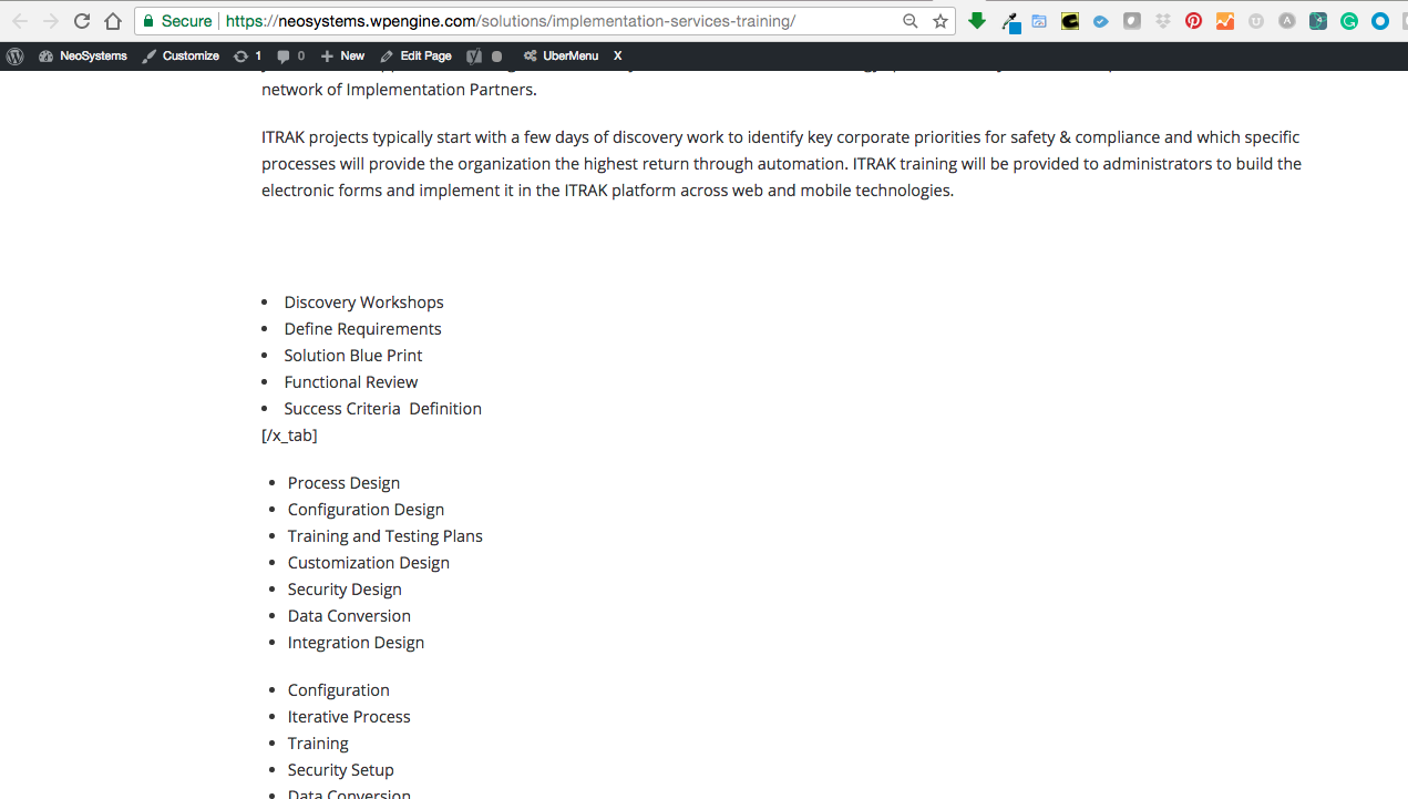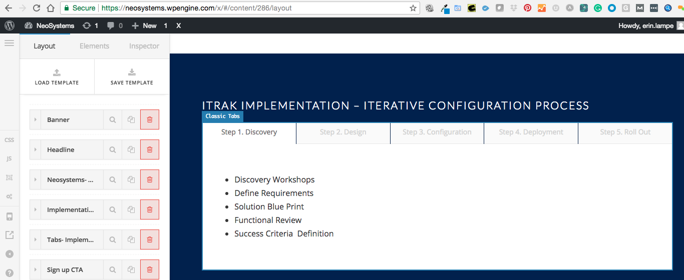 I did some deep testing and It is your fourth section (Implementation Partners) which is corrupted, I created a new page, imported this page template in there and started deleting sections one by one when I deleted the Implementation Partners section, the tabs started to work again see https://neosystems.wpengine.com/test/ Also there was an unclosed HTML tag in your Content, I fixed that too.
