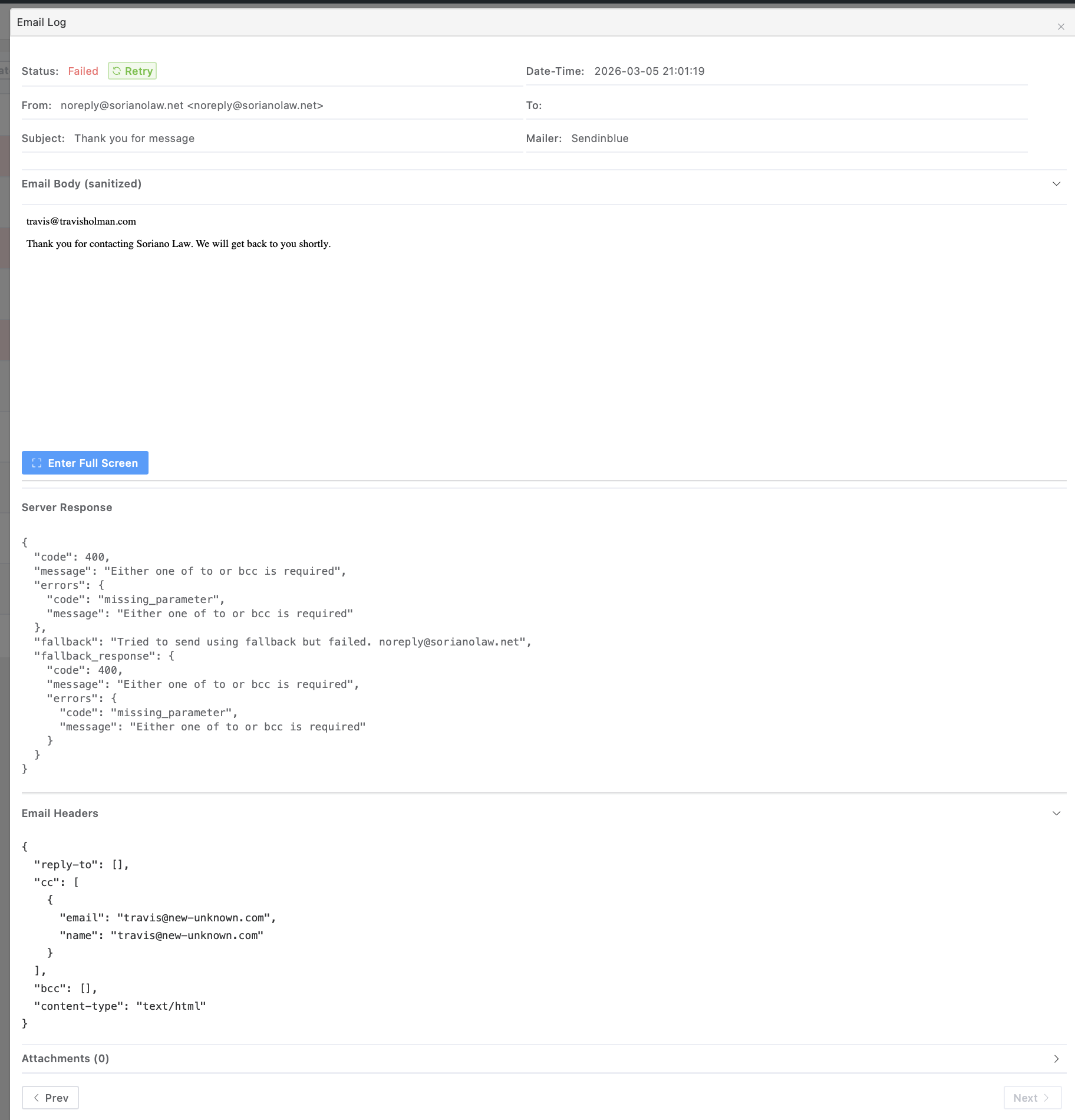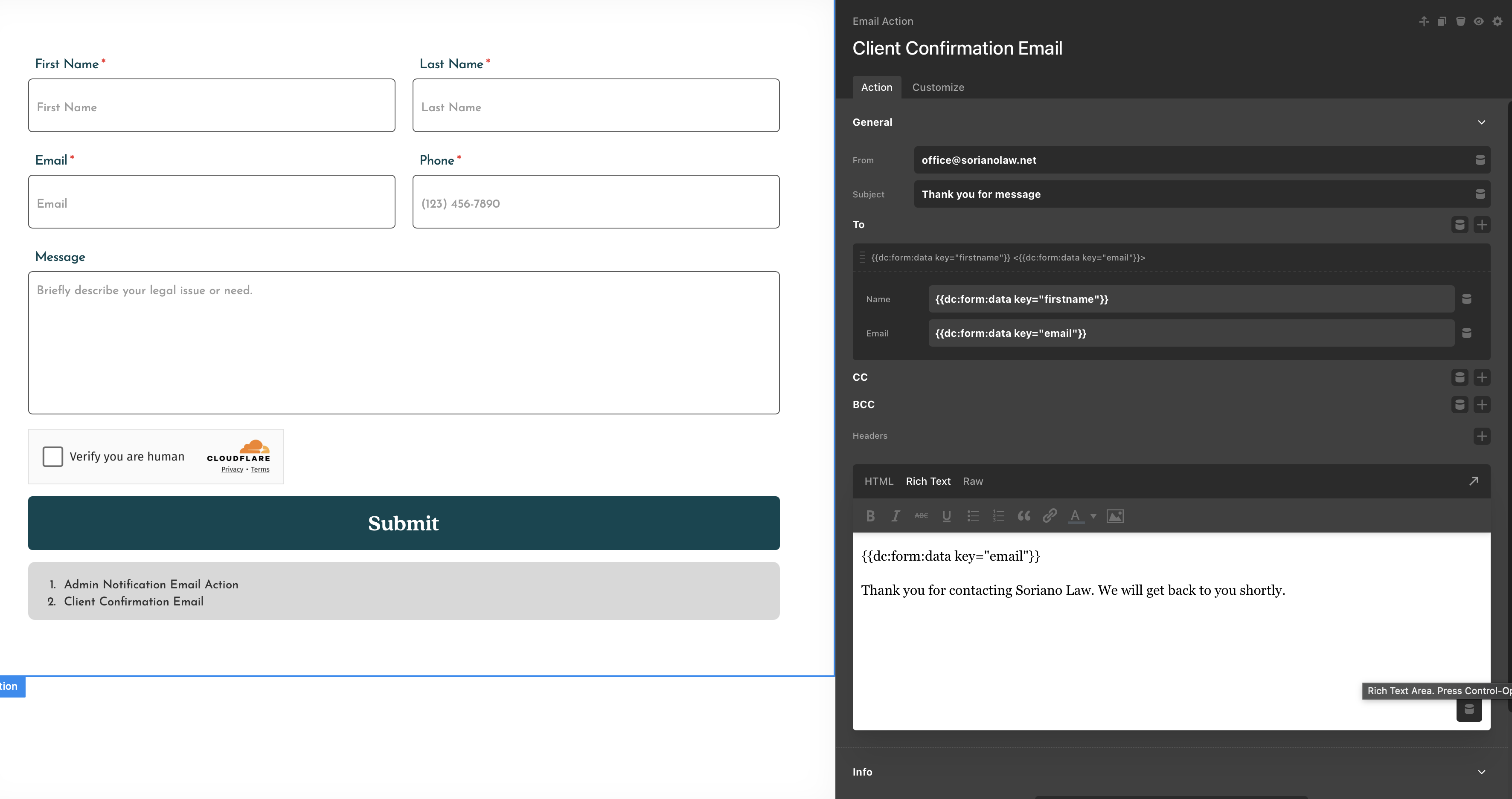 This could be user error, but I can’t seem to to get the new forms to send a confirmation email to the client/customer after they submit a form. I’m using Brevo for SMTP and the logs show a failed send due due to no To: email address. The admin notification works fine with a static to address set. It just doesn’t seem to be passing the email from the form submission correctly. If I change the client notification action to just go to a static email address it goes through and it also correctly displays the email from the form field correctly in the body of the email.