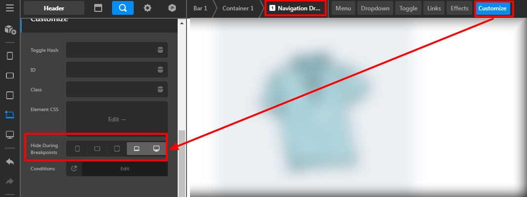 You to add the Navigation Dropdown element for the mobile menu. You need to hide the Navigation Inline element for mobile devices and enable it for desktop devices. You need to hide the Navigation Dropdown element for the larger screen.