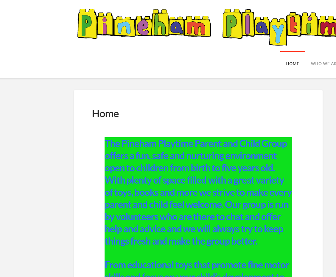 You when you browse to www.pinehamplaytime.co.uk you see there is green background to the writing, login to the portal to edit the page and it shows as yellow.