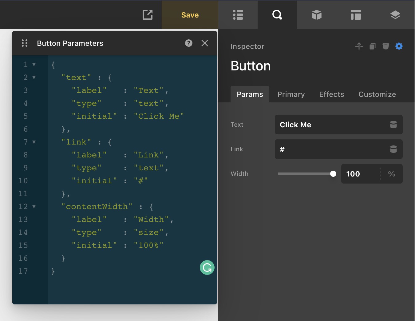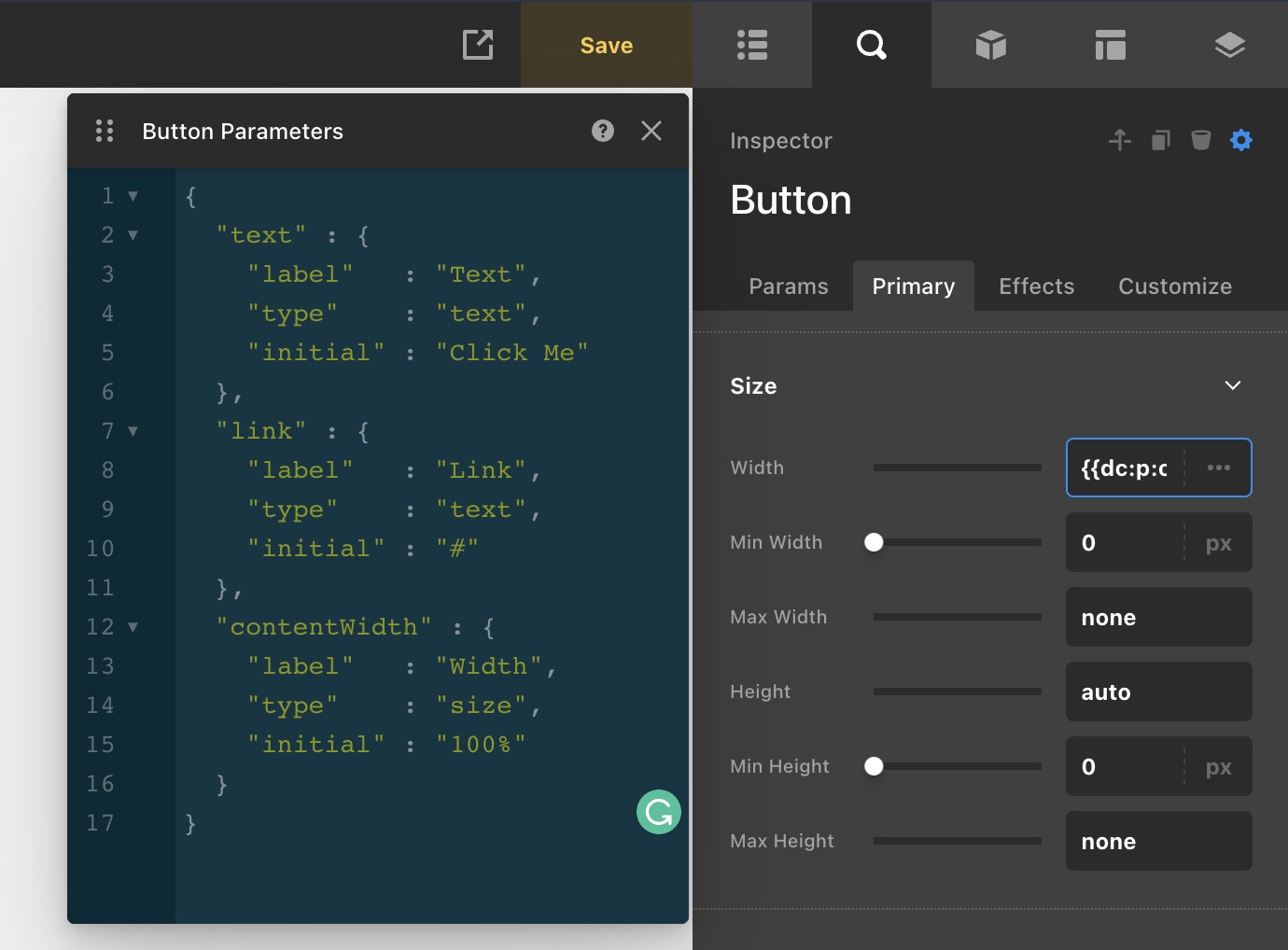 I saw that in the documentation but could not figure out how to wire it up with dynamic content. Is a dynamic content connection not required? I can include the JSON for “ContentWidth” for example and it shows up as controls for the Button component but it does not affect the component - it is not wired in. I am not sure how to link the JSON code added to the Parameters for the button component to the button so it has an affect. For instance I can add the JSON like the example for “contentWidth”, it outputs the slider but changing the slider does not change the Button. How do I do that?