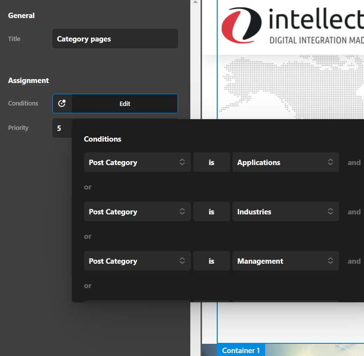 I’d like for our Category Header to be output with the category title for our blog’s category pages. After I saved the following for our Category Header, it works for “Applications” but does not work for any of the other categories. What gets output instead is the title of the first blog post. For some reason it is deferring to our Title Header. I am using “OR” so that the condition is fulfilled for all of our categories. What to do?