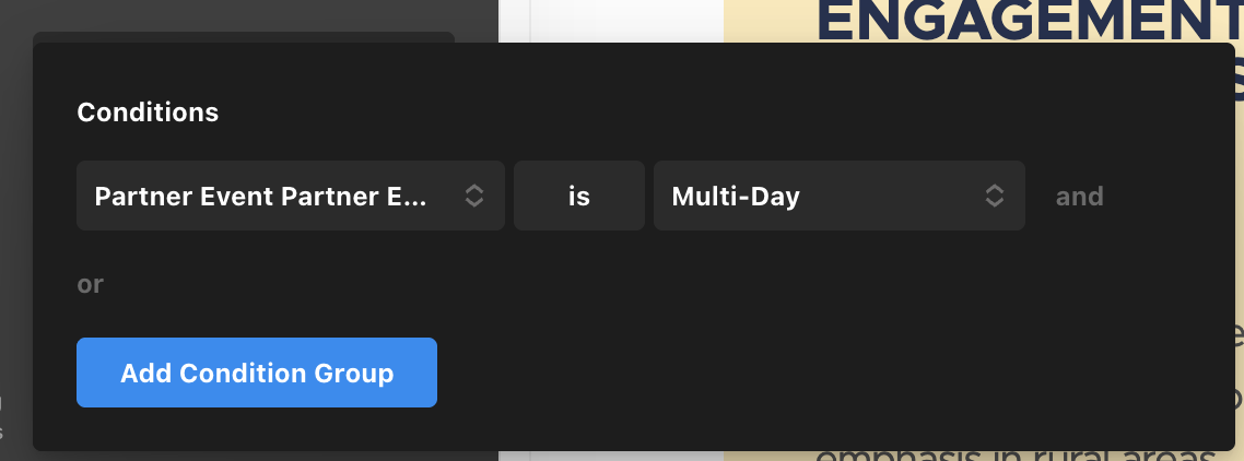 That isn’t an option so I set up CPT tags and made it Multi-Day. I’d like to show that end date only if Multi-Day is the tag. I did “Partner Event Tag is Multi-Day”. But, that doesn’t seem to work either. Can you help me figure this out.