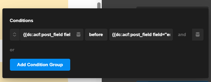 {{dc:acf:post_field field=“end_date”}} is NOT equal to {{dc:acf:post_field field=“start_date”}}