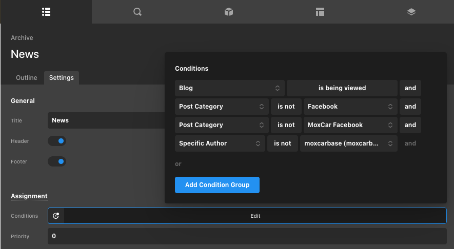 My goal is to exclude posts with a specific category AND/OR a specific author from the blog page I have established on my site: https://www.moxcar.com/news.