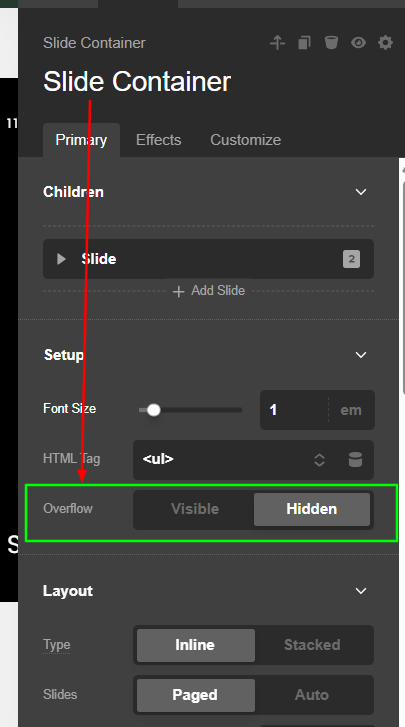 To set the slider within the container, the Overflow option should be set to Hidden for Slider Container. I have set that for testing and it is working as expected.