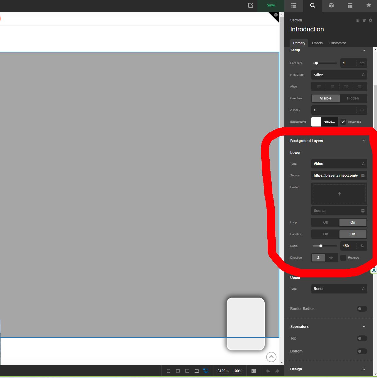 I placed a video streaming from vimeo as a Background Layer in Cornerstone. It was functioning fine at one point but then abruptly stopped working. I tried linking other videos from other providers such as youtube, etc. and nothing shows when I put in the source. Has something changed in the update? Am I missing something? I have attached a screenshot of how I have the video setup. Please advise. Thank you.
