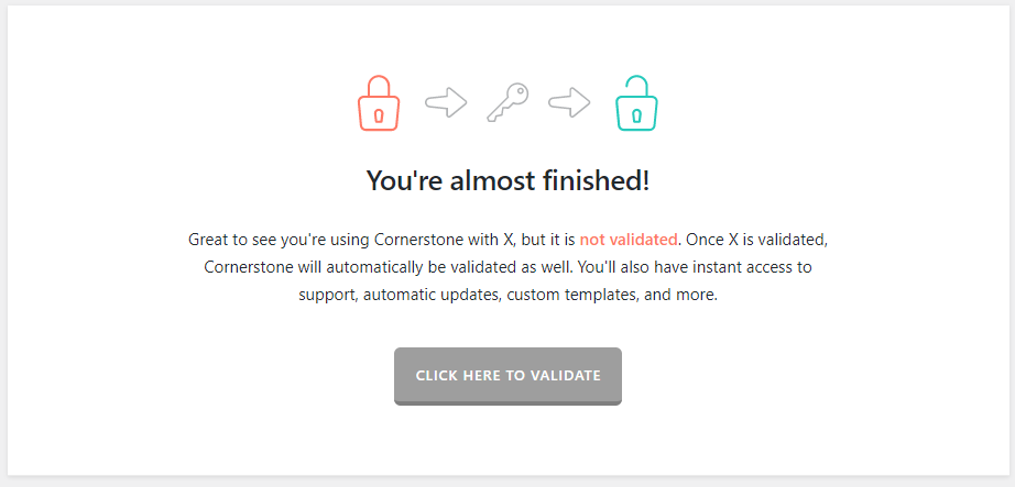 Also I am seeing the below message appear now in the Cornerstone area of my WordPress admin. When I click on validate, it just directs me to the X Theme section of the admin and there is nothing me to click. I am wondering if this is correlated with the formatting issue I am having?