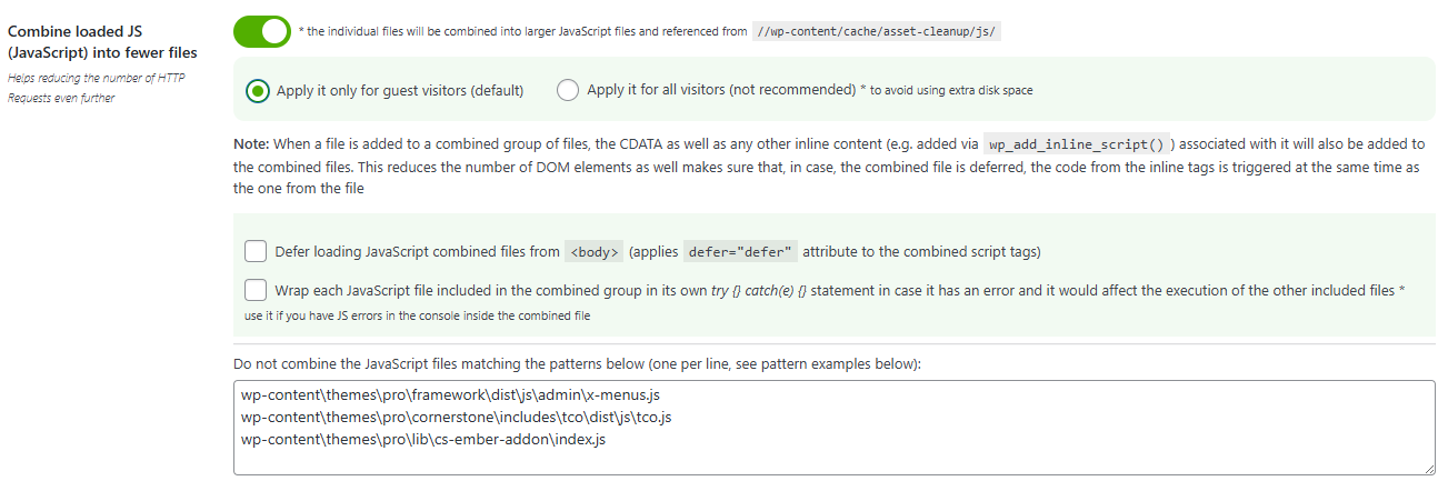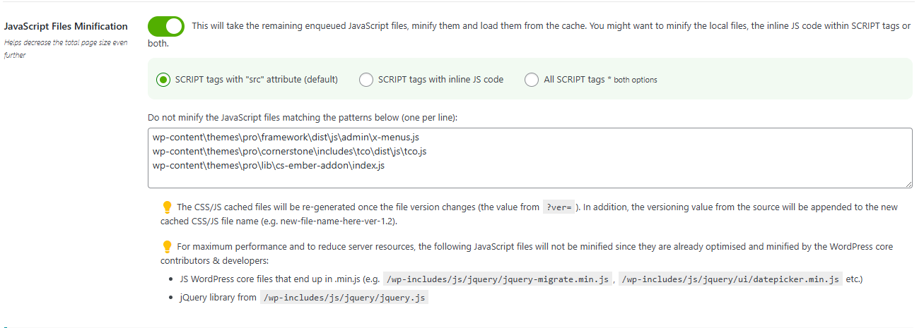 If I put these exclusions in the “minify js” box (first screenshot above), it still doesn’t work. If I put them in the “combine loaded js” box (second screenshot above), everything works fine. Is there a way to enable “minify js” as well?