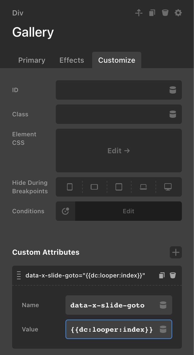 My next step was to try to recreate the gallery using Loopers and Sliders. The main image stacked slider is created from two slider; the first brings through the product’s featured image, the second the gallery using a Looper. Similarly, the thumbnail navigation uses the same set up (noted as “1” in the below screenshot for the featured image slide and “2” for the gallery looper slider), but with an inline slider. I have managed to get it all working, but with two exceptions: