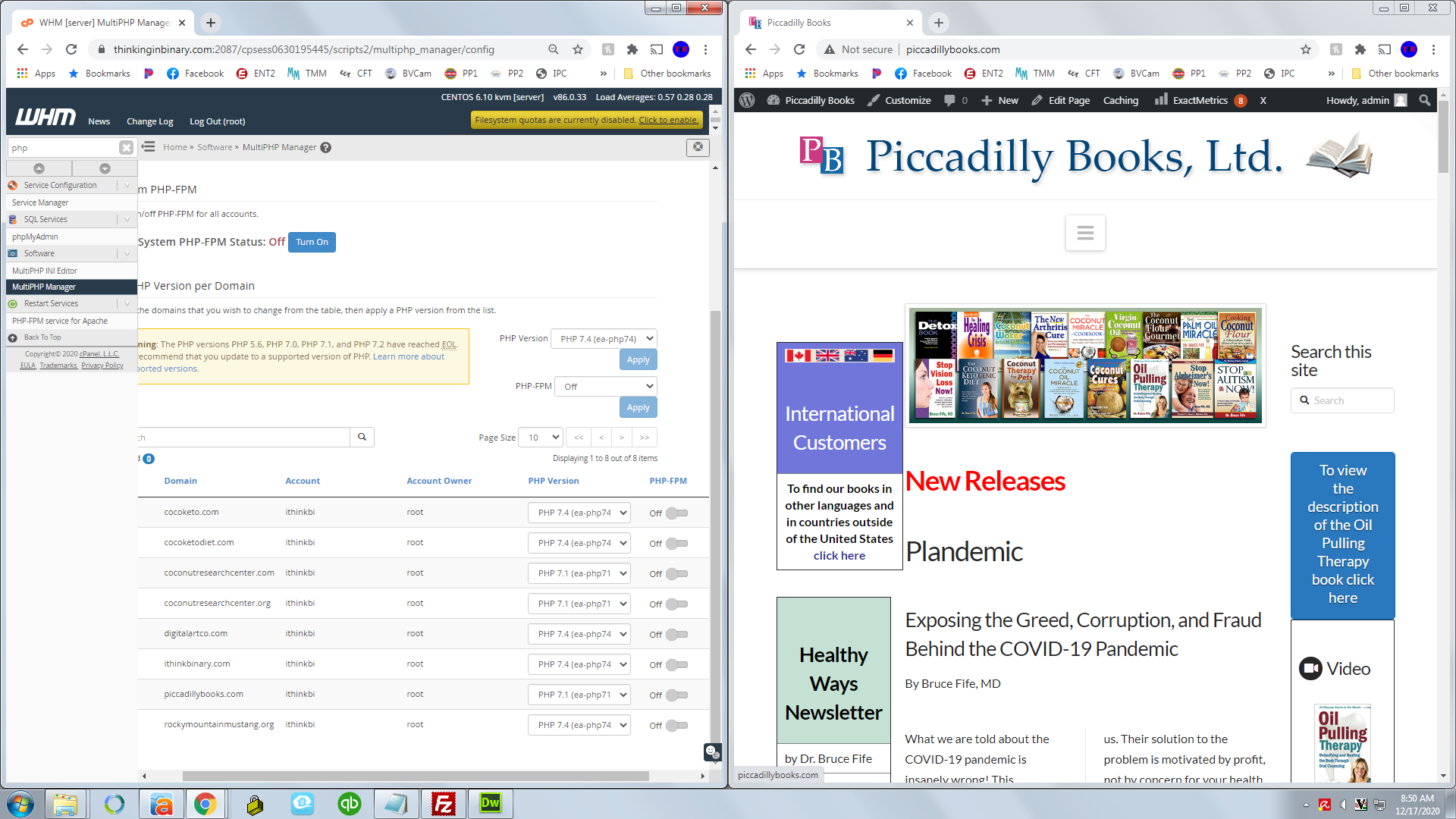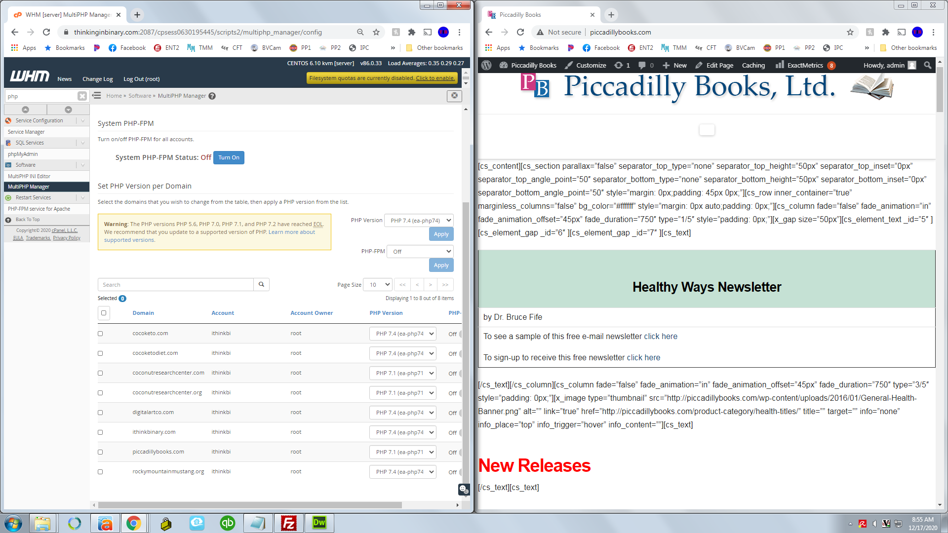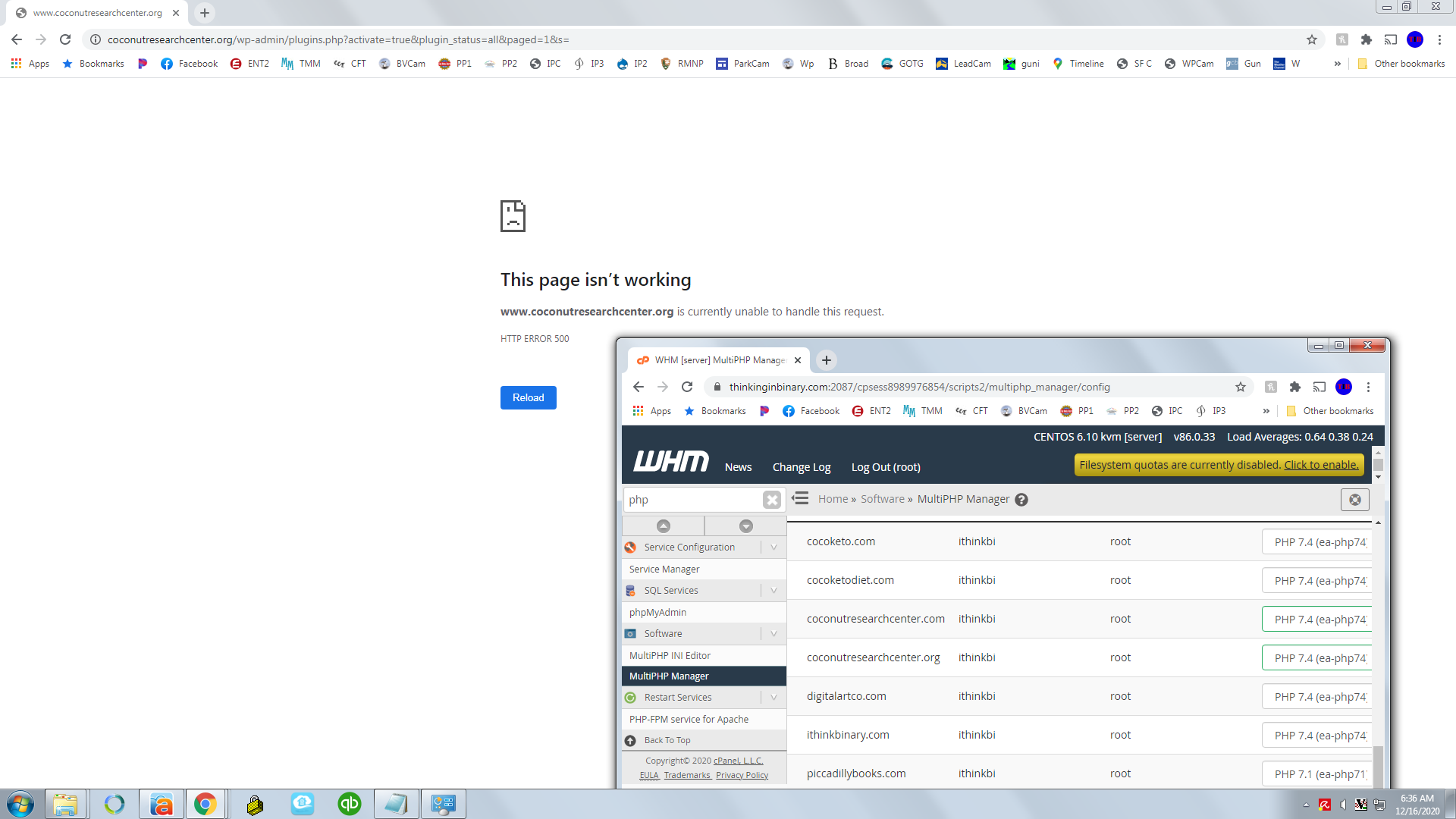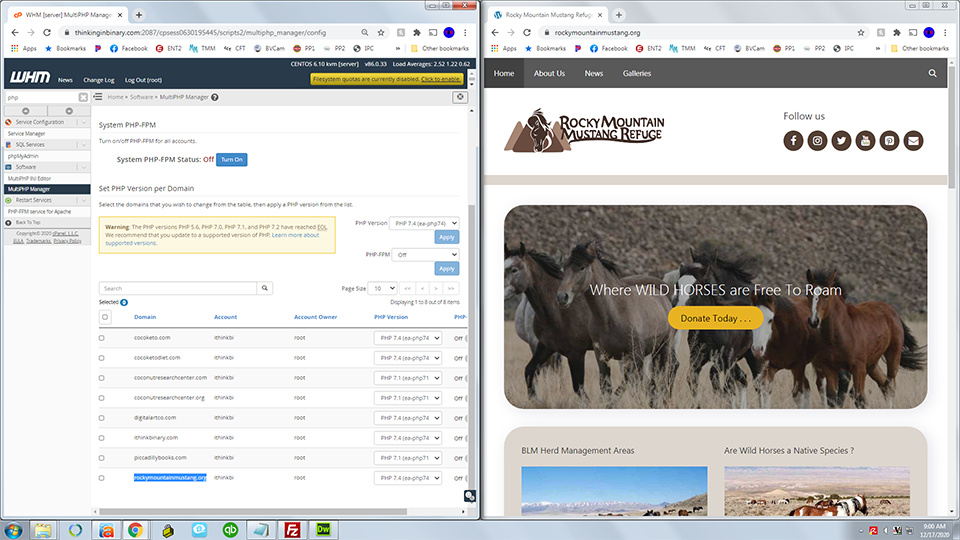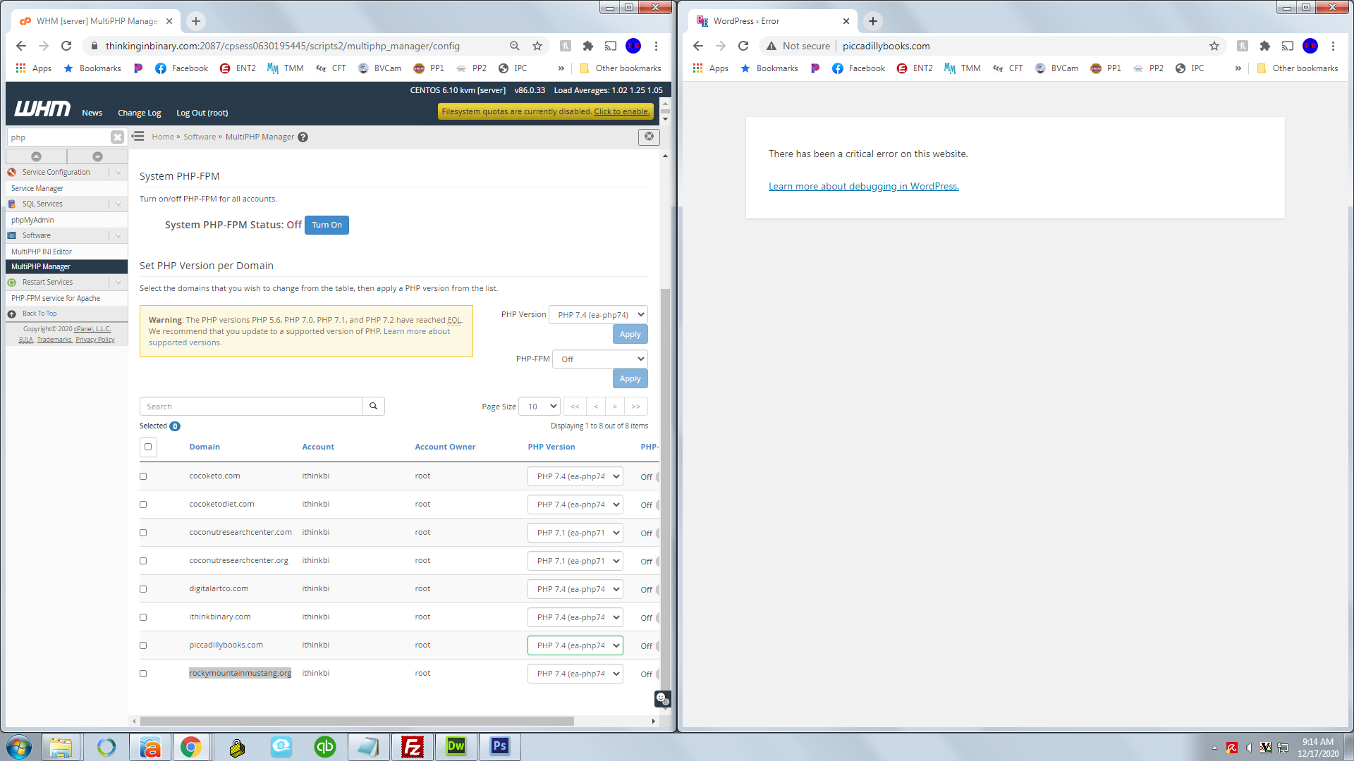feel free to switch this for these site at will, 7.1 works and any over that do not. it is under multiphp manager in the whm link i sent.