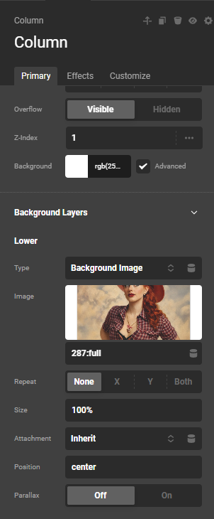 Then tweak the Column settings like positioning the background image, setting the background image size and having a white background color.
