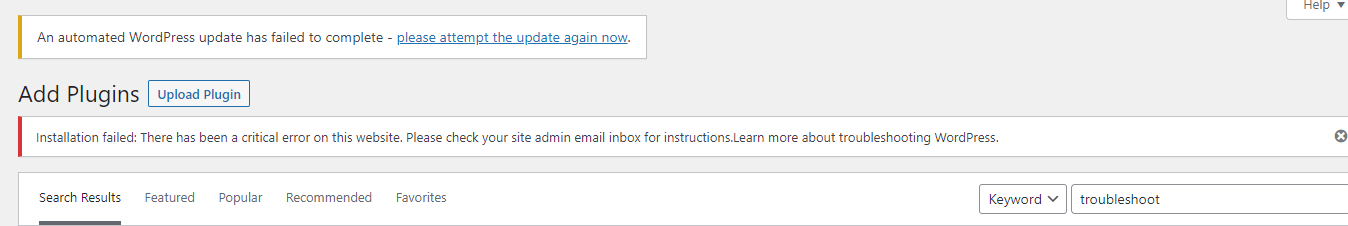 - Critical site errors blocking plugin installs