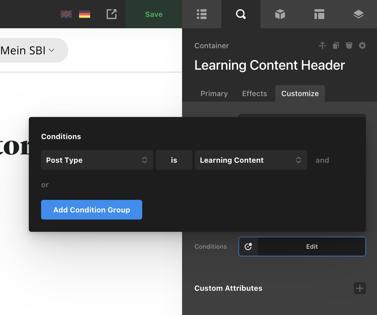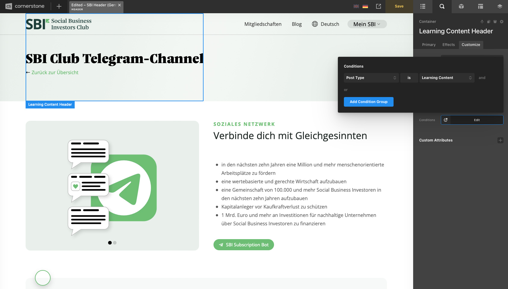 I have CS header which displays divs conditionally. E.g. one div shall be rendered for specific pages, another one for a custom post type named “Learning Content”.