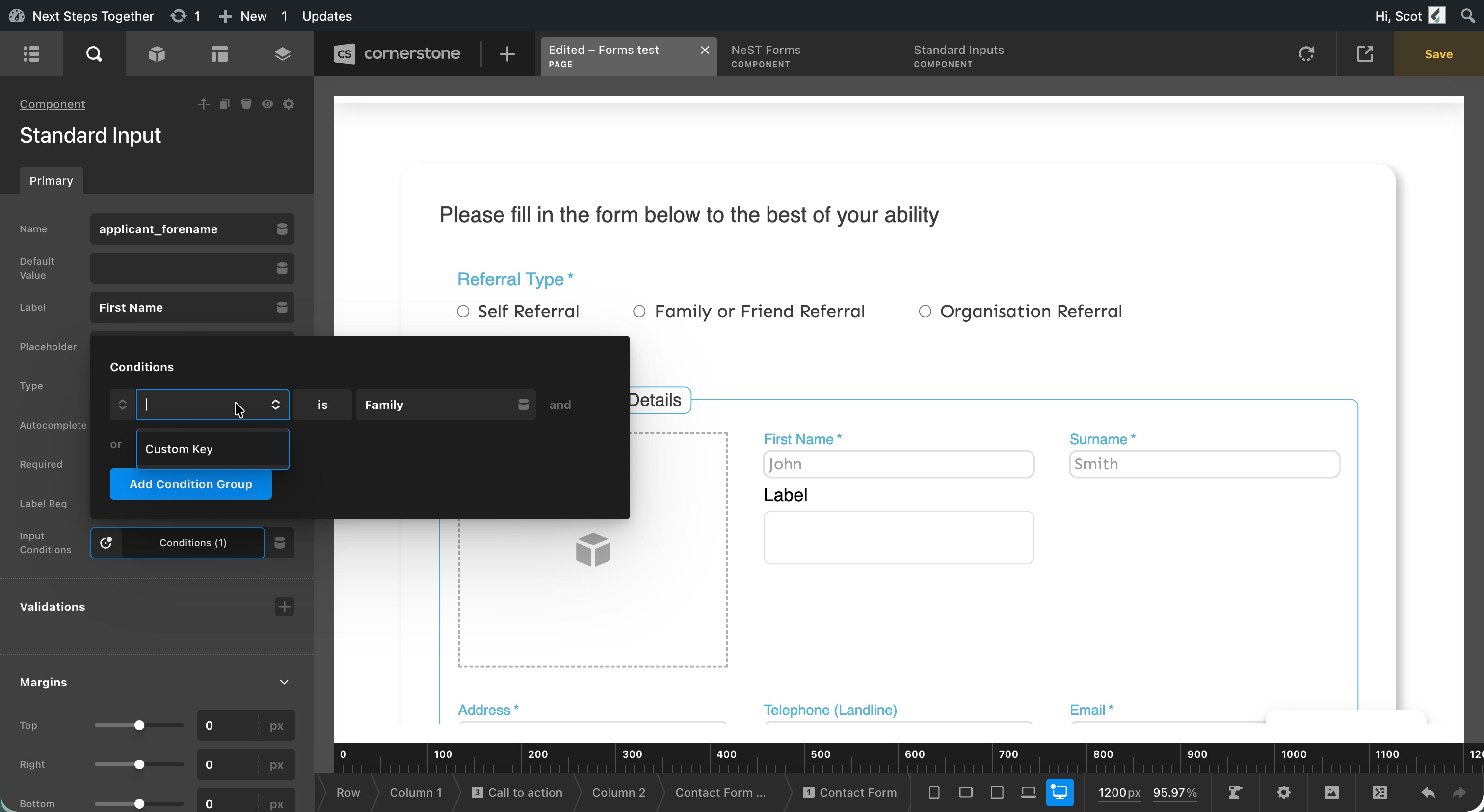 when using a normal form input field, I can see form fields in input conditions, but they do not work. ie I set a condition of referral_type is Family and whether the value is Family or not, nothing changes at all