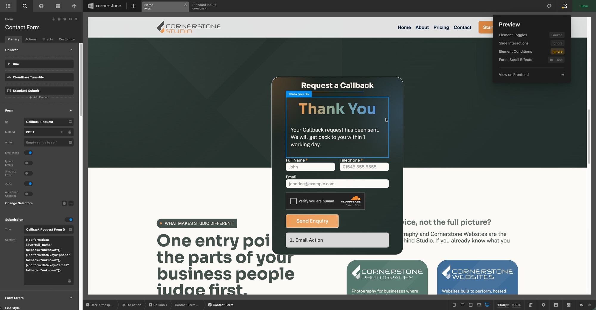 I have a simple callback form with cloudflare turnstile connected. I also have a thank you div