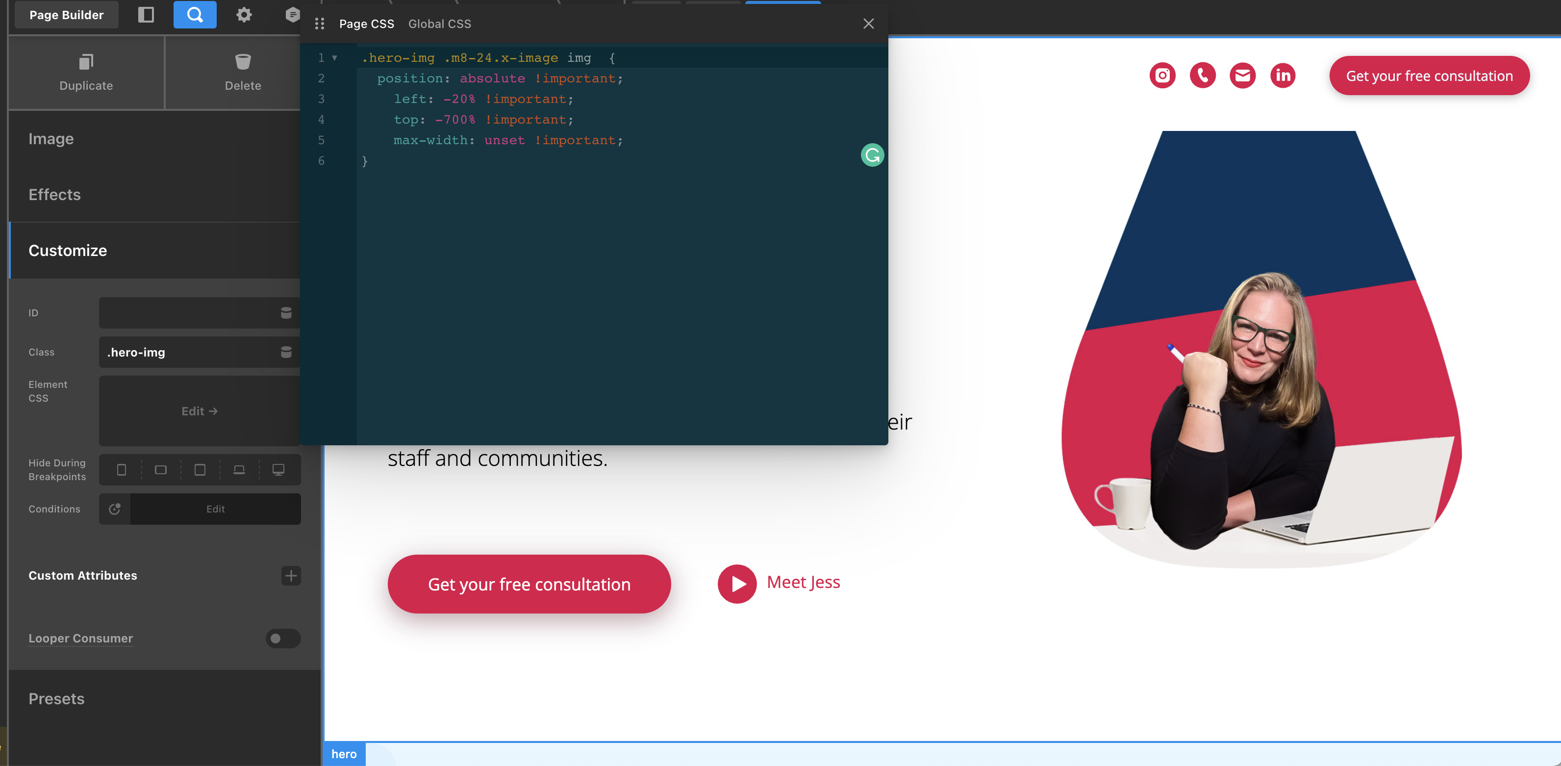I am having trouble finding the correct CSS selector for this hero image. I added a class to it (.hero-img) but am having trouble finding the correct element.