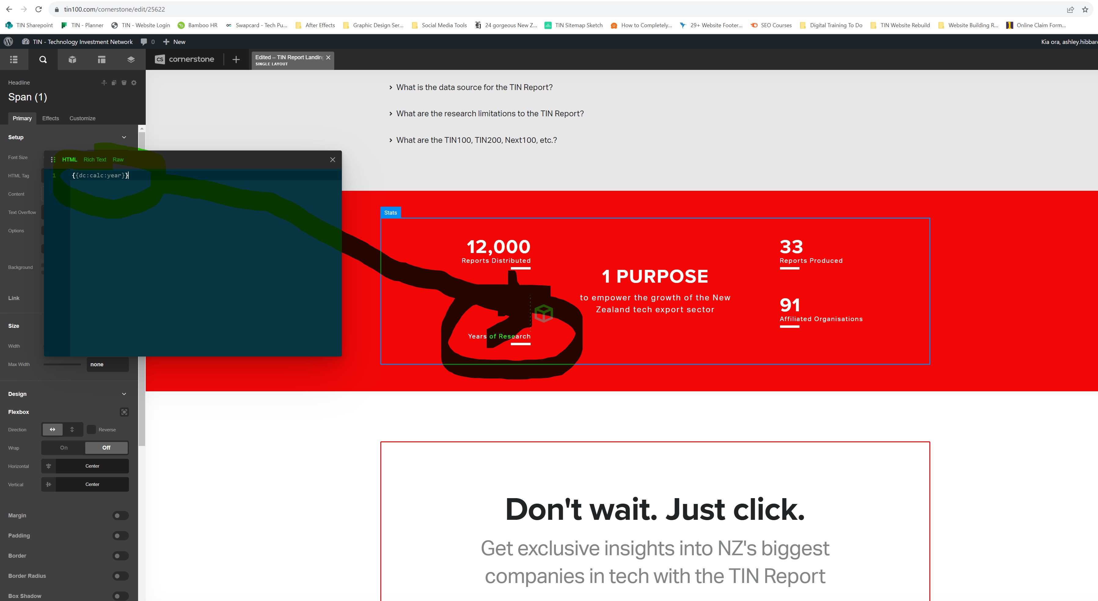 A while ago, ya’ll helped me create some custom dynamic text that would calculate the number of years between the current year and 1999. It is used on the home page, in the second section when you click on “TIN Reports”. It is also used on this page, in the red section at the bottom - https://tin100.com/nz-tech-sector-facts/2022-tin-report/. See screenshots. For some reason the text has disappeared and not appearing. We are using a child theme. I can’t access the previous conversations we had because they were part of ONE, which I’m not longer using.