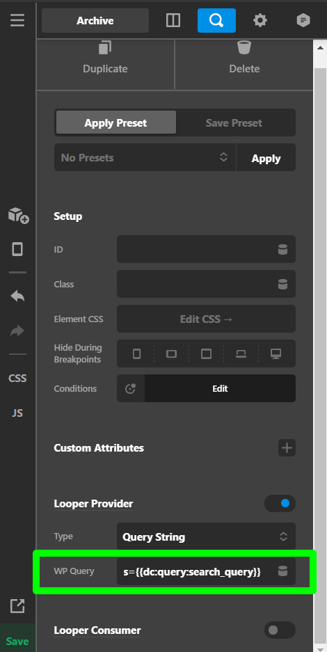 It seems that the Search Query value is set to the Query String. The Query String should be s={{dc:query:search_query}}. I went ahead and added the s parameter and it started working properly.