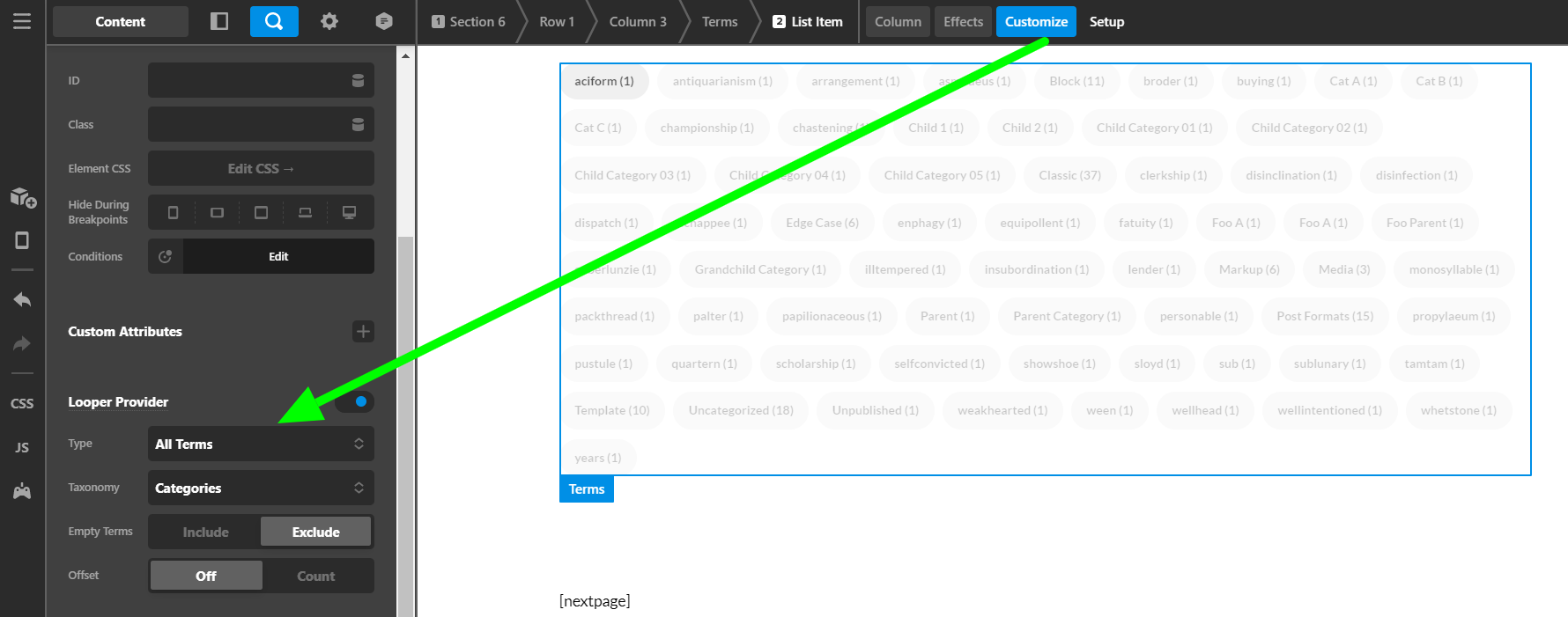 At the moment I have a Provider set to All Terms, then a Consumer set to All, then a button element with dynamic content set to post title. This solution is not working.