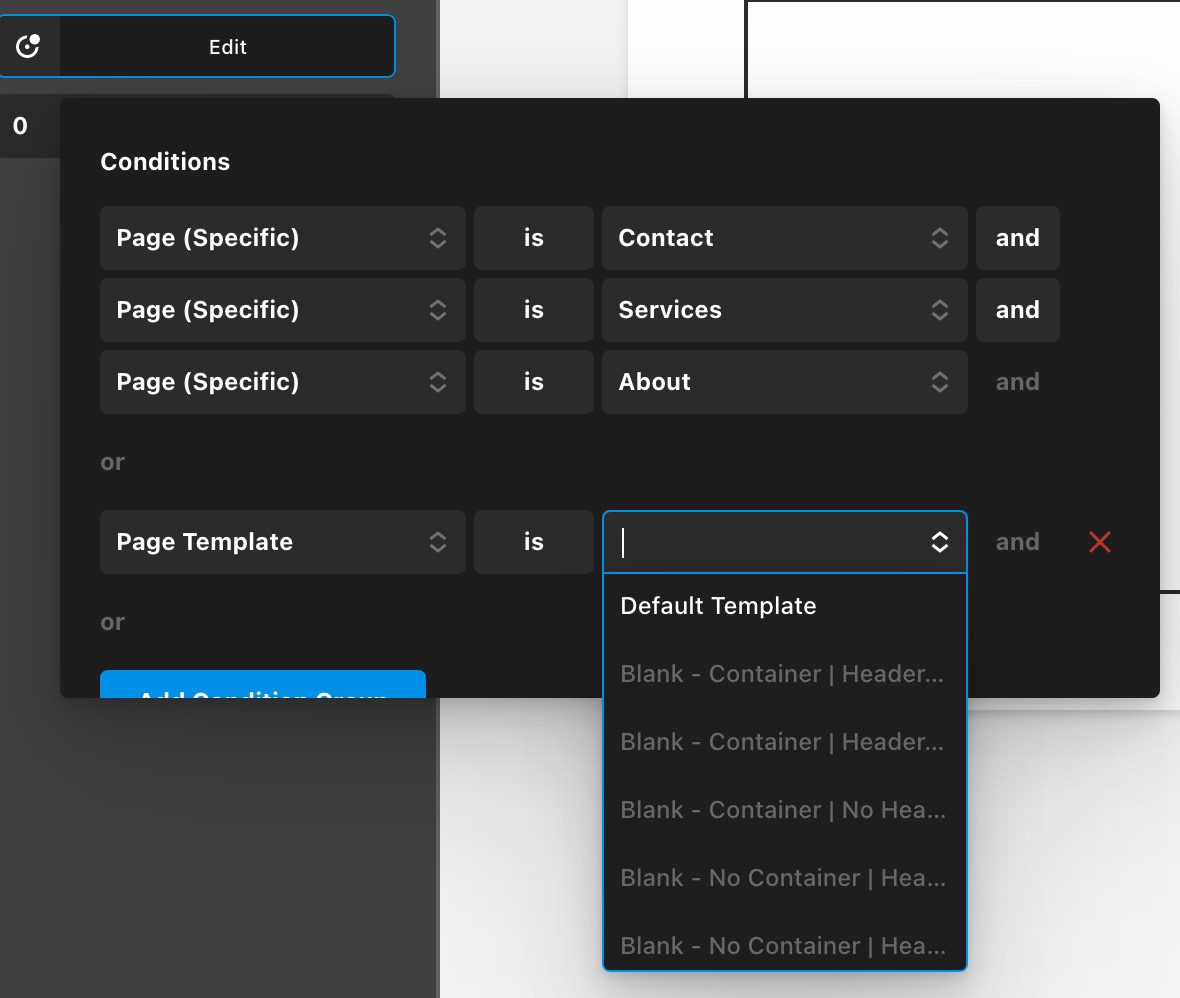 Thanks for writing in and for your kind words! Just to make sure we’re on the same page here, you’re talking about the “Conditions” popup that appears and how the blue button is cut off at the bottom there? If so, that popup is scrollable and that styling is intentional. Most conditions for users will be more straightforward with the builders (e.g. “Post Type is Page,” things like that). For more complex chaining like you’re seeing here, the popup will expand to a certain point, but we have to put a cap on it eventually as it can’t keep growing indefinitely for very long conditions as we might not be able to position it properly depending on screen size. So at a certain point, the popup reaches its max height, but you can still scroll within that popup to add as much content as you need.
