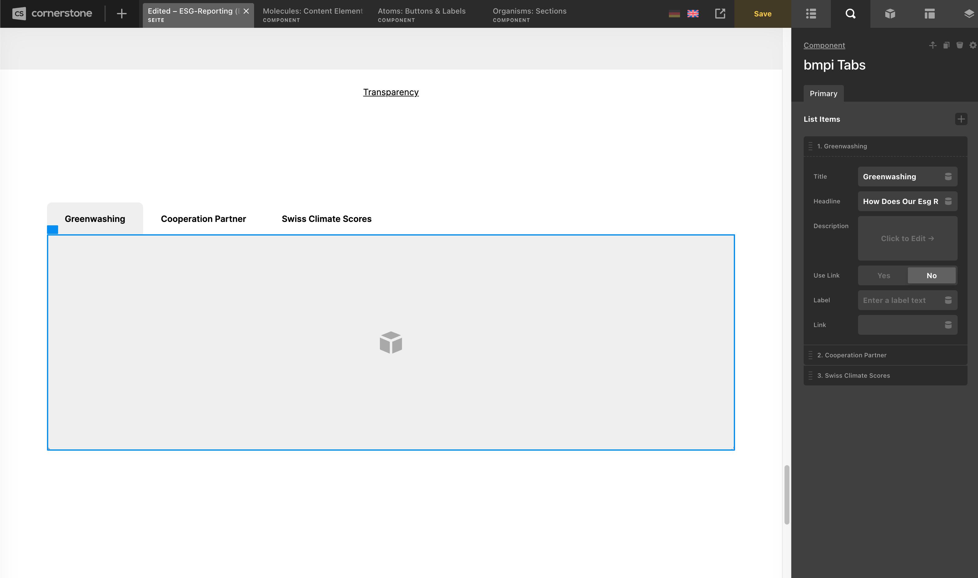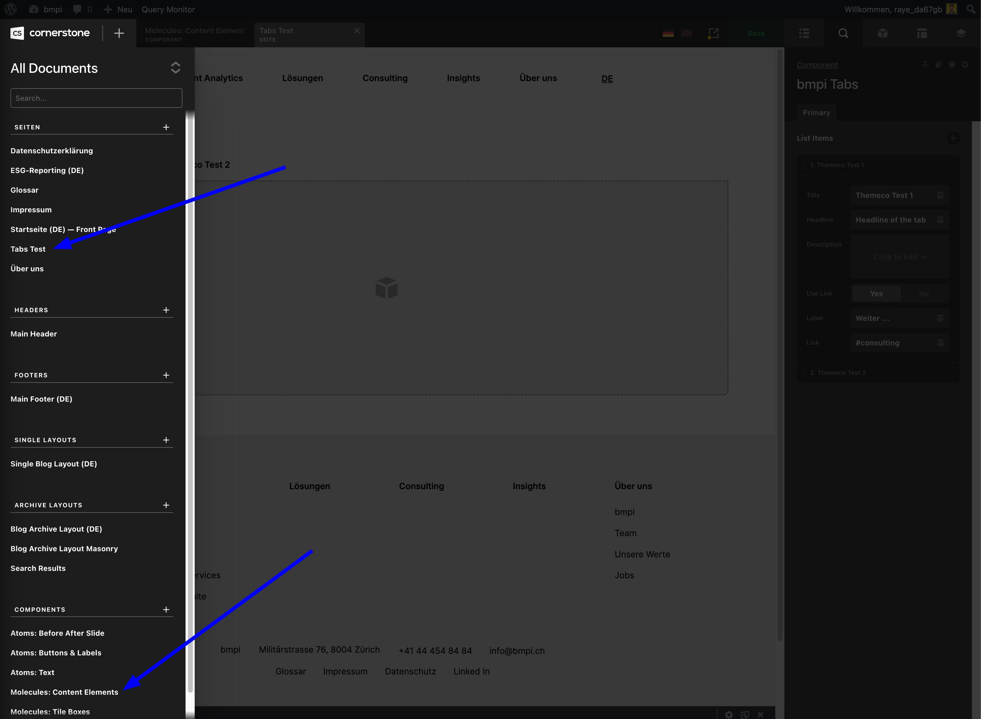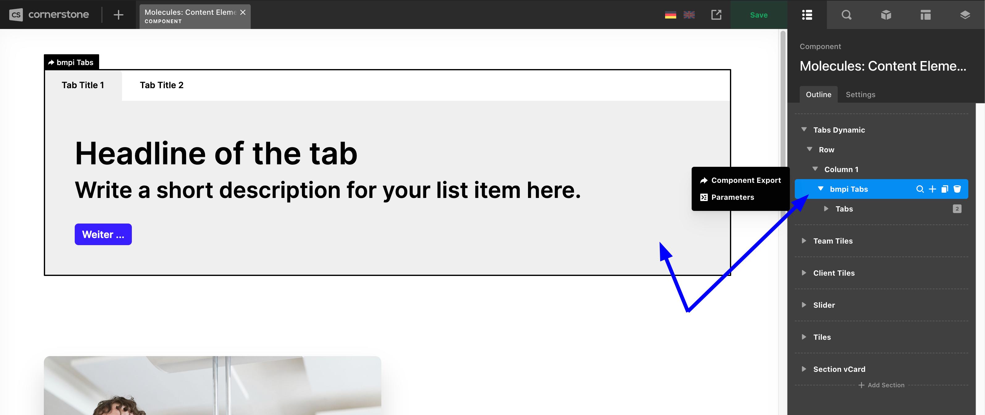 But in Cornerstone editor after I created an instance of the tab component, the rendering of the content of the first tab is broken. Instead there is a blue empty border. If I click the other tabs, everythings works as expected.