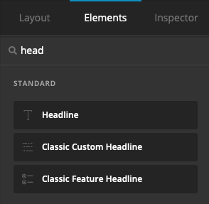 However, when I go to add a new element to the page, I often think to myself “I need a headline element”, so I’ll hit the search field and type “head”. But I won’t get any of the headline presets that don’t have “headline” somewhere in their name.