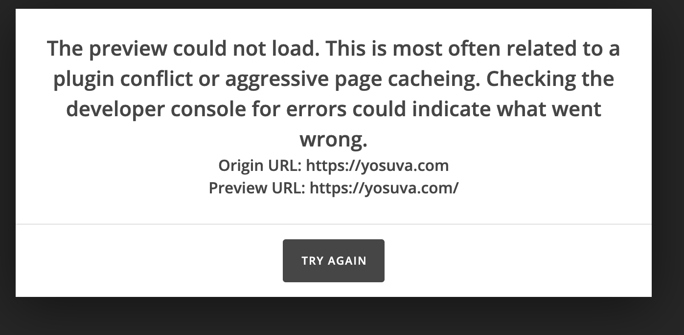 The preview could not load. This is most often related to a plugin conflict or aggressive page cacheing. Checking the developer console for errors could indicate what went wrong.